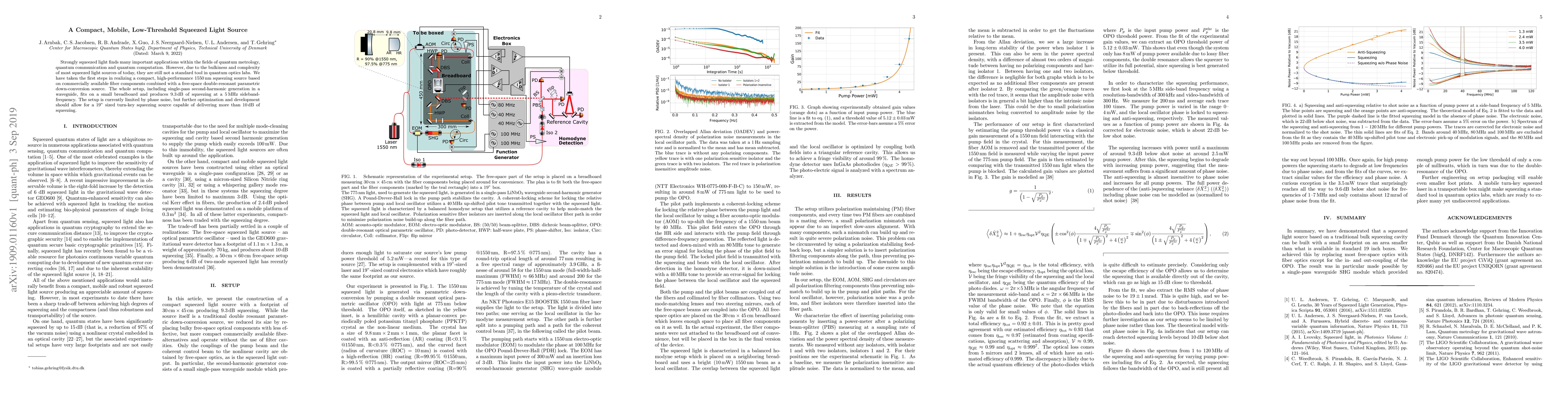 This paper presents a compact, mobile squeezed light source at 1550 nm, utilizing fiber components and a double-resonant parametric down-conversion, achieving 9.3 dB of squeezing at 5 MHz. Future optimizations aim to produce a 19" turn-key device delivering over 10 dB of squeezing.