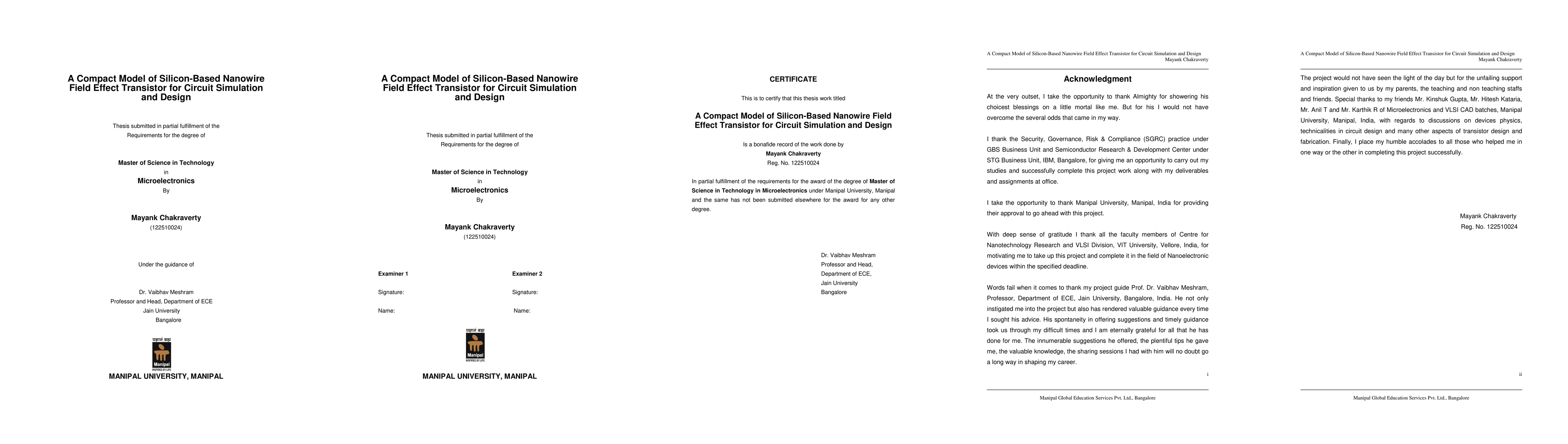 This research develops a compact model for silicon-based nanowire field-effect transistors (SNWTs) to explore device physics and assess performance limits, employing DFT simulations. The study compares electrical characteristics of silicon and germanium nanowire diodes and analyzes gate all-around nanowire FETs with different gate dielectrics, examining temperature effects.