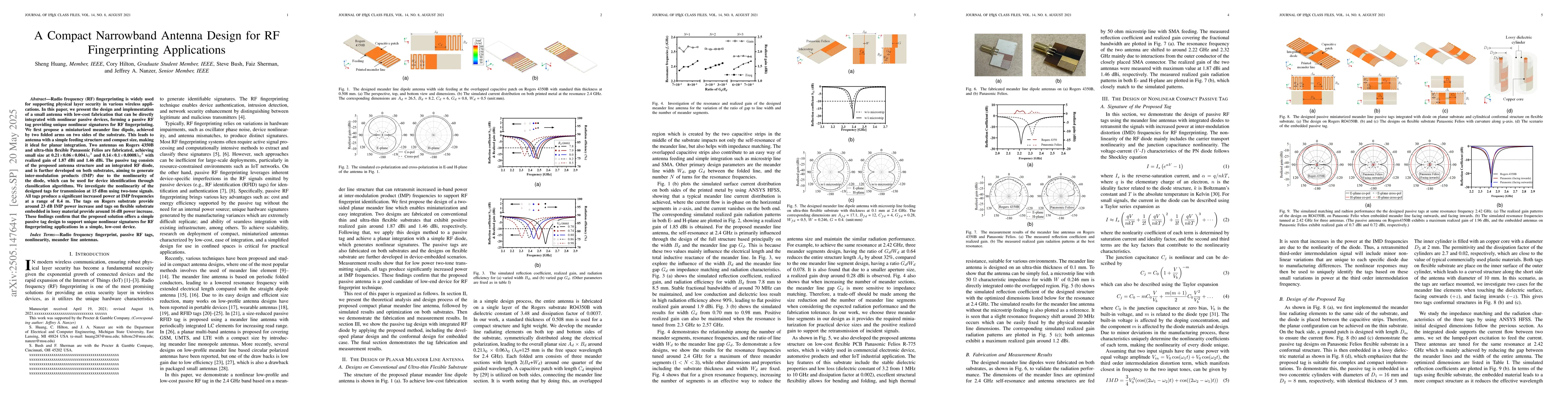 The paper introduces a compact, low-cost meander line dipole antenna design integrated with nonlinear passive devices for RF fingerprinting applications, generating unique nonlinear signatures through inter-modulation products.