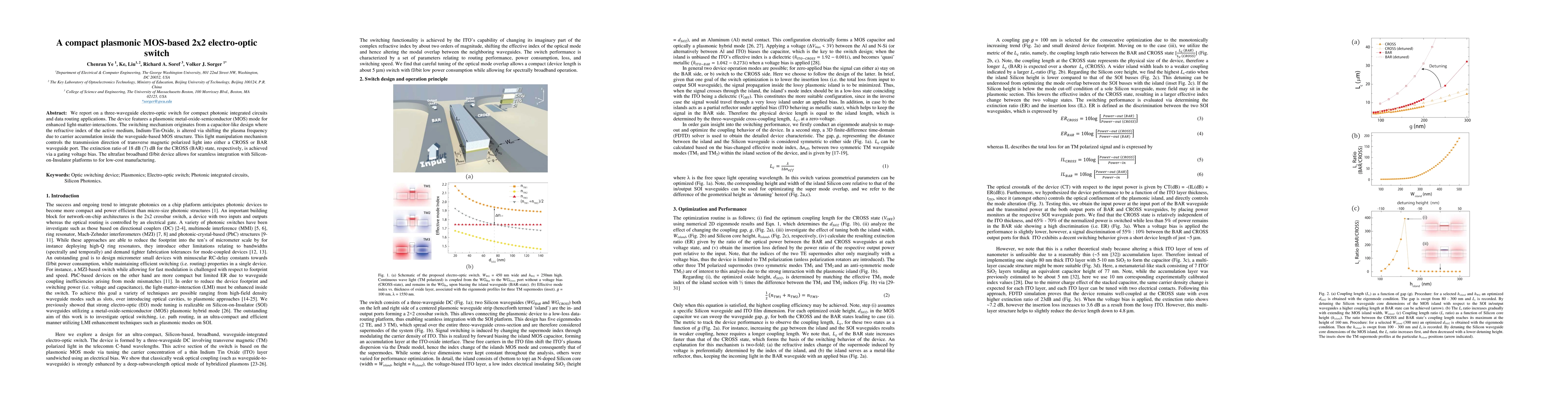 We report on a three-waveguide electro-optic switch for compact photonic integrated circuits and data routing applications. The device features a plasmonic metal-oxide-semiconductor (MOS) mode for enhanced light-matter-interactions. The switching mechanism originates from a capacitor-like design where the refractive index of the active medium, Indium-Tin-Oxide, is altered via shifting the plasma frequency due to carrier accumulation inside the waveguide-based MOS structure. This light manipulation mechanism controls the transmission direction of transverse magnetic polarized light into either a CROSS or BAR waveguide port. The extinction ratio of 18 dB (7) dB for the CROSS (BAR) state, respectively, is achieved via a gating voltage bias. The ultrafast broadband fJ/bit device allows for seamless integration with Siliconon- Insulator platforms to for low-cost manufacturing.