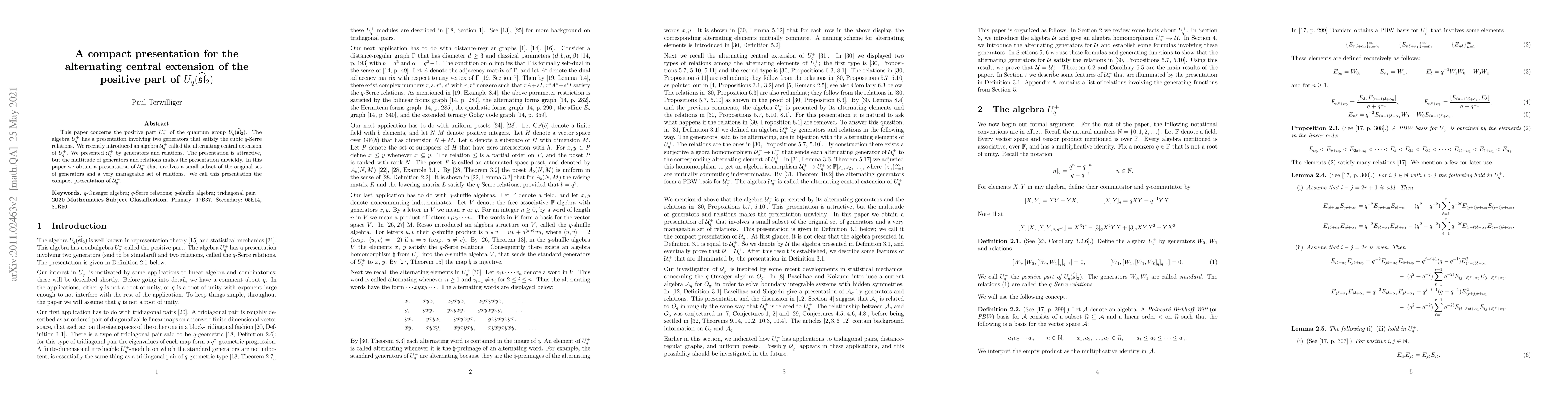 This paper concerns the positive part $U^+_q$ of the quantum group $U_q({\widehat{\mathfrak{sl}}}_2)$. The algebra $U^+_q$ has a presentation involving two generators that satisfy the cubic $q$-Serre relations. We recently introduced an algebra $\mathcal U^+_q$ called the alternating central extension of $U^+_q$. We presented $\mathcal U^+_q$ by generators and relations. The presentation is attractive, but the multitude of generators and relations makes the presentation unwieldy. In this paper we obtain a presentation of $\mathcal U^+_q$ that involves a small subset of the original set of generators and a very manageable set of relations. We call this presentation the compact presentation of $\mathcal U^+_q$.