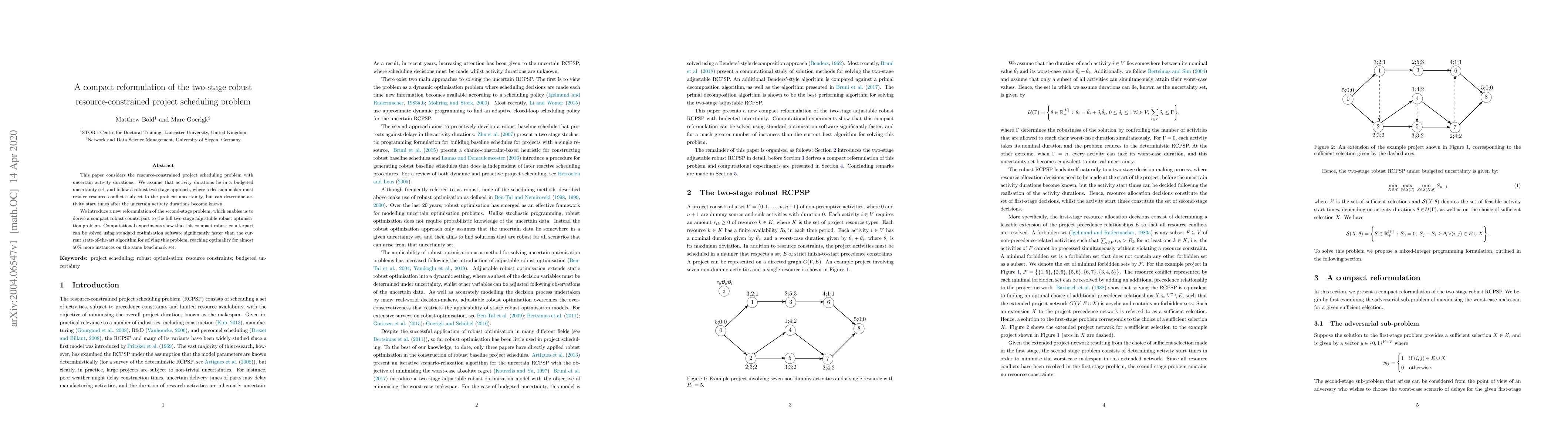 This paper considers the resource-constrained project scheduling problem with uncertain activity durations. We assume that activity durations lie in a budgeted uncertainty set, and follow a robust two-stage approach, where a decision maker must resolve resource conflicts subject to the problem uncertainty, but can determine activity start times after the uncertain activity durations become known. We introduce a new reformulation of the second-stage problem, which enables us to derive a compact robust counterpart to the full two-stage adjustable robust optimisation problem. Computational experiments show that this compact robust counterpart can be solved using standard optimisation software significantly faster than the current state-of-the-art algorithm for solving this problem, reaching optimality for almost 50% more instances on the same benchmark set.