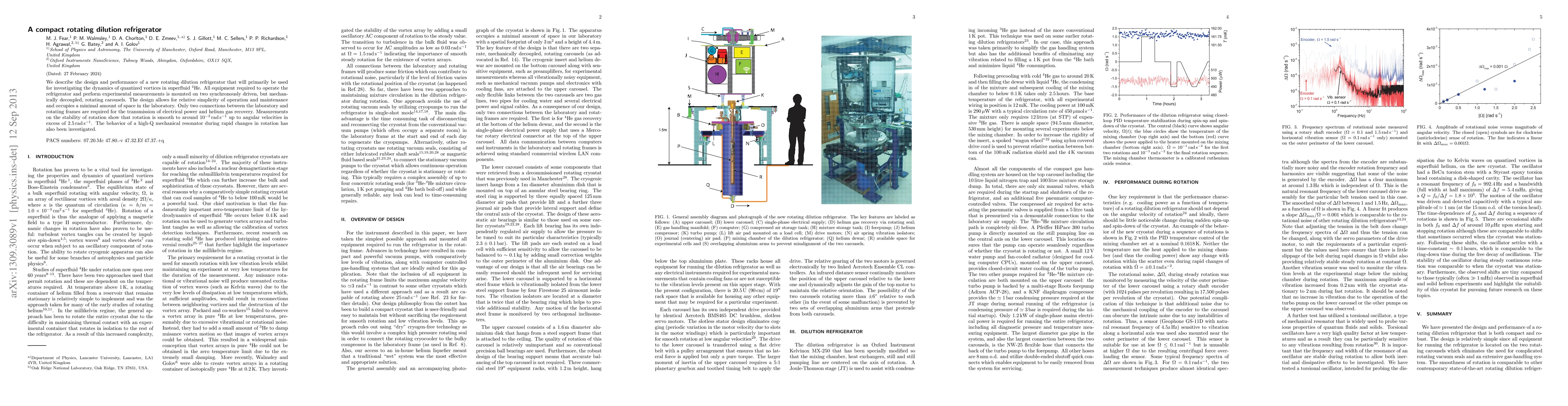 This paper details a compact rotating dilution refrigerator designed for studying quantized vortices in superfluid 4He, featuring minimal space requirements and simplified operation through two rotating carousels. The design maintains smooth rotation up to 2.5 rad/s and investigates the behavior of a high-Q resonator during rapid rotational changes.