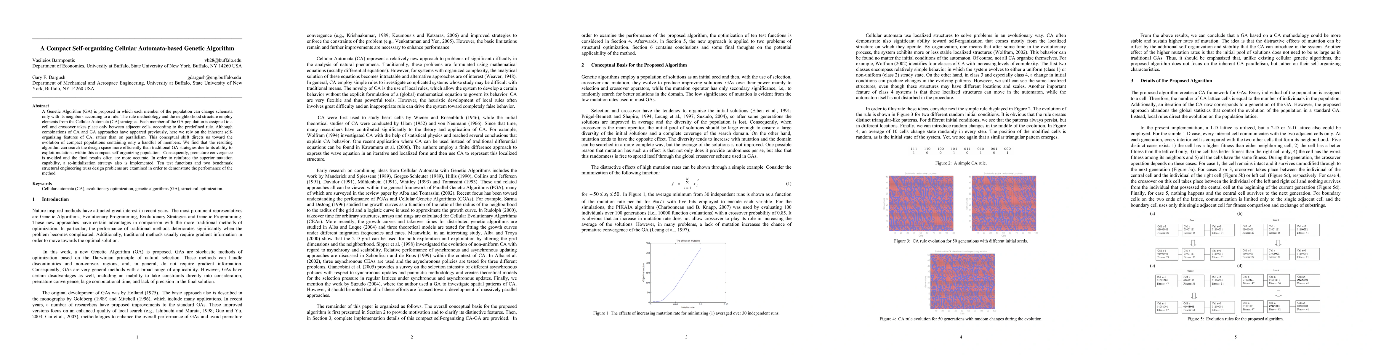 A Genetic Algorithm (GA) is proposed in which each member of the population can change schemata only with its neighbors according to a rule. The rule methodology and the neighborhood structure employ elements from the Cellular Automata (CA) strategies. Each member of the GA population is assigned to a cell and crossover takes place only between adjacent cells, according to the predefined rule. Although combinations of CA and GA approaches have appeared previously, here we rely on the inherent self-organizing features of CA, rather than on parallelism. This conceptual shift directs us toward the evolution of compact populations containing only a handful of members. We find that the resulting algorithm can search the design space more efficiently than traditional GA strategies due to its ability to exploit mutations within this compact self-organizing population. Consequently, premature convergence is avoided and the final results often are more accurate. In order to reinforce the superior mutation capability, a re-initialization strategy also is implemented. Ten test functions and two benchmark structural engineering truss design problems are examined in order to demonstrate the performance of the method.