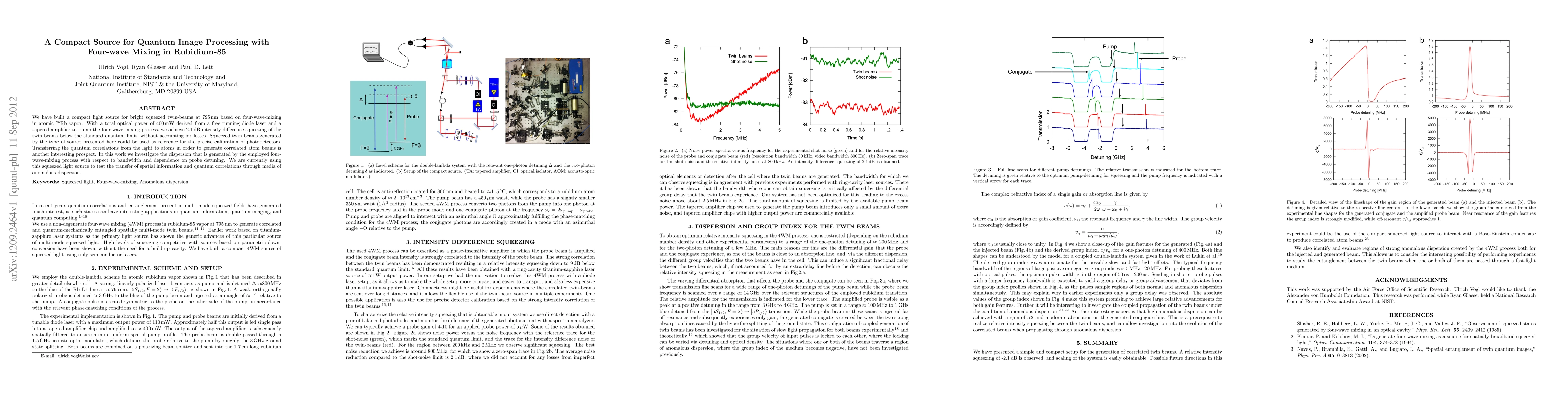 We have built a compact light source for bright squeezed twin-beams at 795\,nm based on four-wave-mixing in atomic $^{85}$Rb vapor. With a total optical power of 400\,mW derived from a free running diode laser and a tapered amplifier to pump the four-wave-mixing process, we achieve 2.1\,dB intensity difference squeezing of the twin beams below the standard quantum limit, without accounting for losses. Squeezed twin beams generated by the type of source presented here could be used as reference for the precise calibration of photodetectors. Transferring the quantum correlations from the light to atoms in order to generate correlated atom beams is another interesting prospect. In this work we investigate the dispersion that is generated by the employed four-wave-mixing process with respect to bandwidth and dependence on probe detuning. We are currently using this squeezed light source to test the transfer of spatial information and quantum correlations through media of anomalous dispersion.