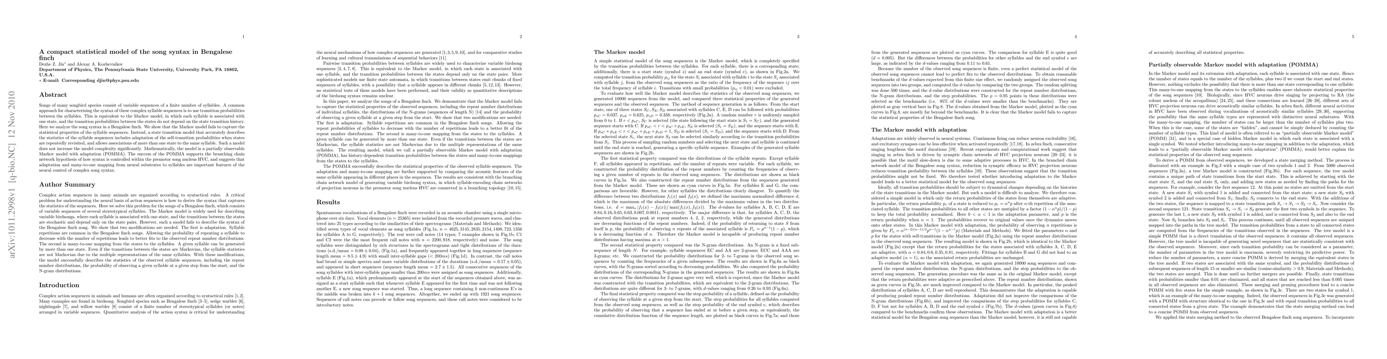 This paper proposes a partially observable Markov model with adaptation (POMMA) to better describe the song syntax in Bengalese finches, showing that traditional Markov models are insufficient. The POMMA model's success supports the branching chain network hypothesis for neural control of song syntax.