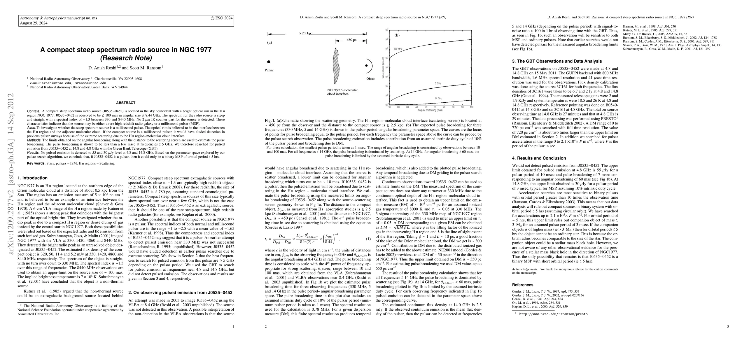 A compact steep spectrum radio source (J0535-0452) is located in the sky coincident with a bright optical rim in the HII region NGC1977. J0535-0452 is observed to be $\leq 100$ mas in angular size at 8.44 GHz. The spectrum for the radio source is steep and straight with a spectral index of -1.3 between 330 and 8440 MHz. No 2 \mu m IR counter part for the source is detected. These characteristics indicate that the source may be either a rare high redshift radio galaxy or a millisecond pulsar (MSP). Here we investigate whether the steep spectrum source is a millisecond pulsar.The optical rim is believed to be the interface between the HII region and the adjacent molecular cloud. If the compact source is a millisecond pulsar, it would have eluded detection in previous pulsar surveys because of the extreme scattering due to the HII region--molecular cloud interface. The limits obtained on the angular broadening along with the distance to the scattering screen are used to estimate the pulse broadening. The pulse broadening is shown to be less than a few msec at frequencies $\gtsim$ 5 GHz. We therefore searched for pulsed emission from J0535-0452 at 14.8 and 4.8 GHz with the Green Bank Telescope (GBT). No pulsed emission is detected to 55 and 30 \mu Jy level at 4.8 and 14.8 GHz. Based on the parameter space explored by our pulsar search algorithm, we conclude that, if J0535-0452 is a pulsar, then it could only be a binary MSP of orbital period $\ltsim$ 5 hrs.