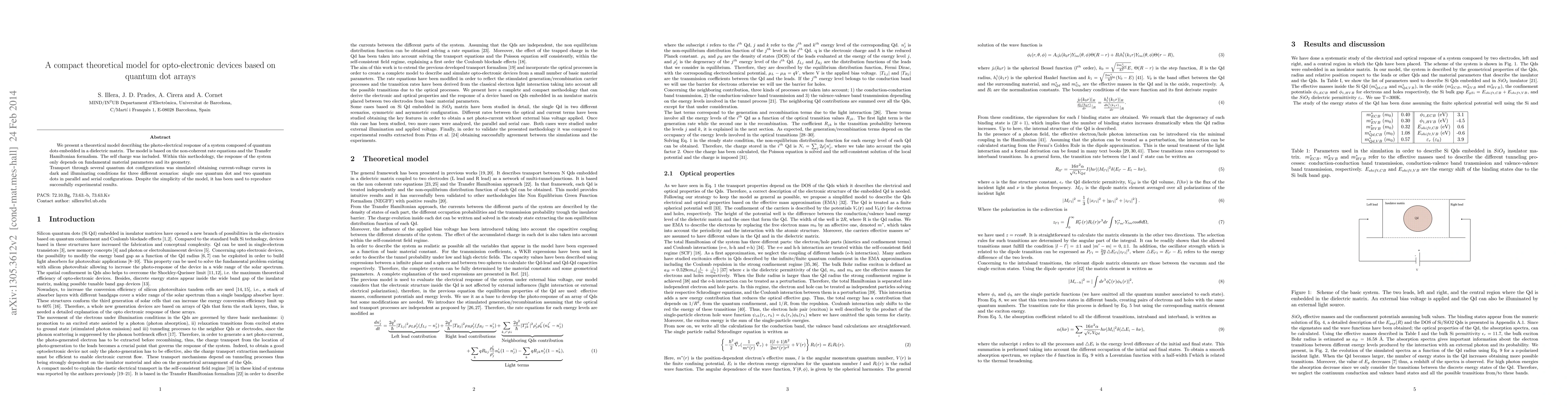 This paper introduces a theoretical model for opto-electronic devices using quantum dot arrays, based on non-coherent rate equations and Transfer Hamiltonian formalism. The model successfully reproduces experimental results for various quantum dot configurations, including single and parallel/serial arrangements.