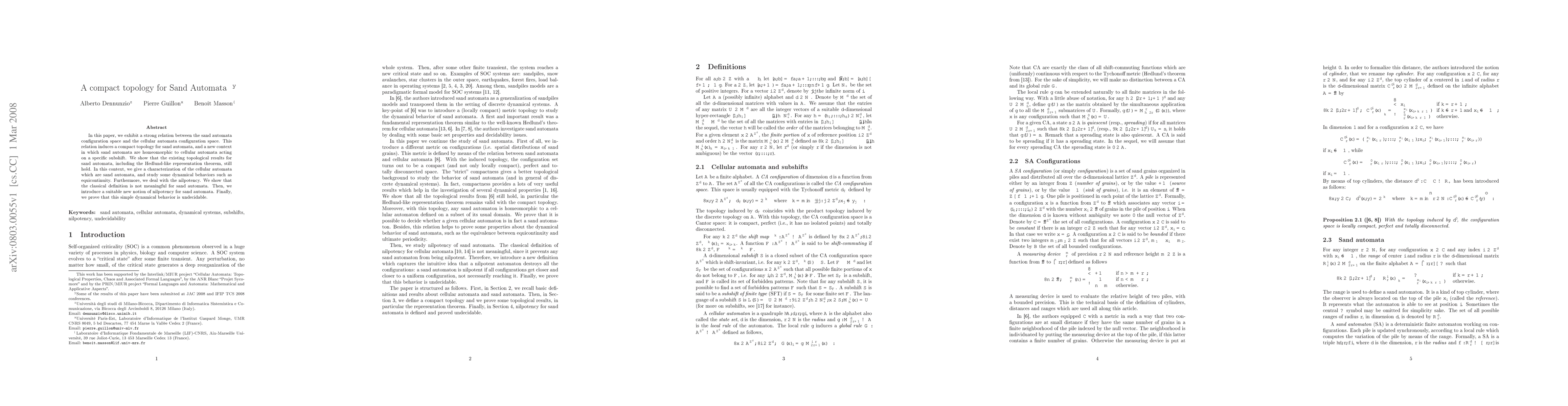 This paper establishes a compact topology for sand automata by linking their configuration space to that of cellular automata, demonstrating homeomorphism to specific subshifts. It also introduces a new notion of nilpotency for sand automata, proving the undecidability of this behavior.