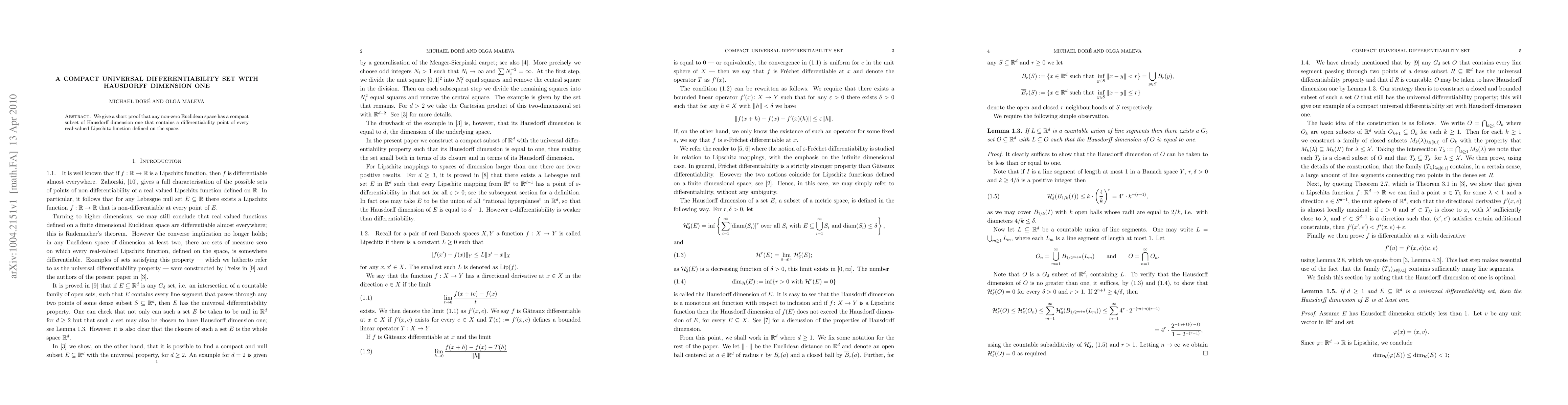 The paper presents a concise proof for the existence of a compact set in any non-zero Euclidean space with Hausdorff dimension one, which includes differentiability points for every real-valued Lipschitz function. This set serves as a universal differentiability set.