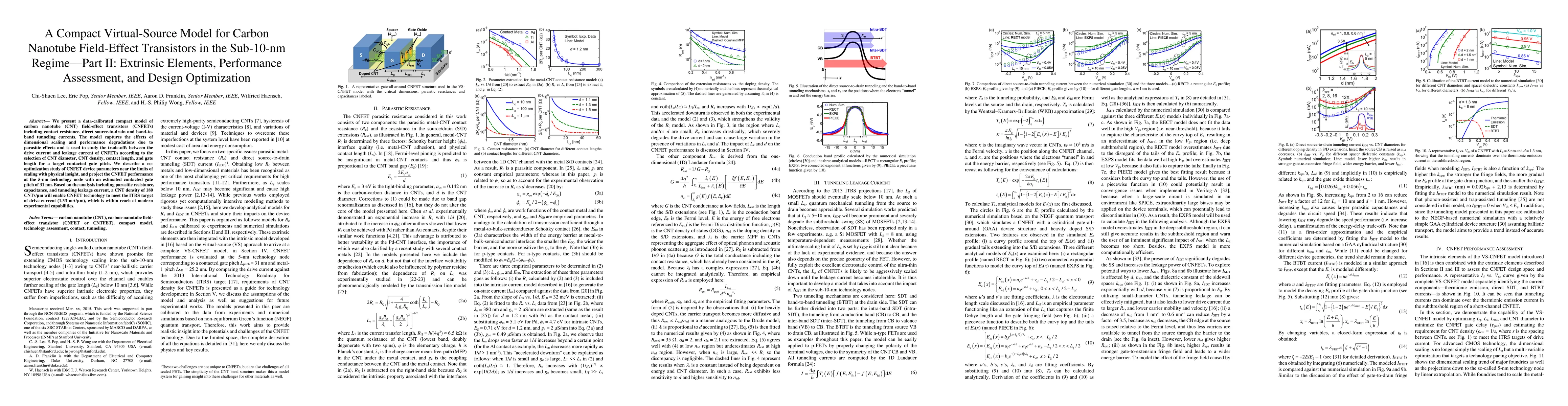 This paper presents a compact model for carbon nanotube field-effect transistors, detailing extrinsic elements and optimizing performance. The study assesses trade-offs between drive and leakage currents, projecting that a CNT density of 180 CNTs/μm can meet ITRS targets at the 5-nm technology node.