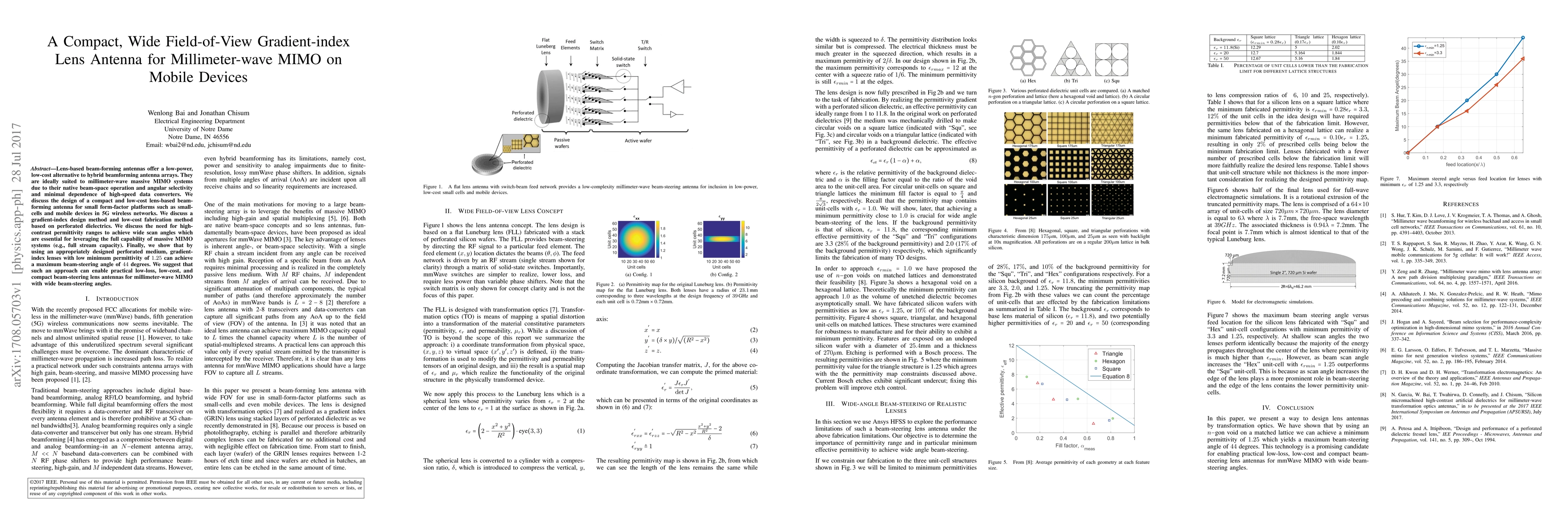 This paper presents a compact, wide field-of-view gradient-index lens antenna designed for millimeter-wave MIMO on mobile devices, utilizing perforated dielectrics for low-cost fabrication. The proposed lens achieves a maximum beam-steering angle of 44 degrees, enabling practical low-loss and cost-effective beam-steering for 5G wireless networks.