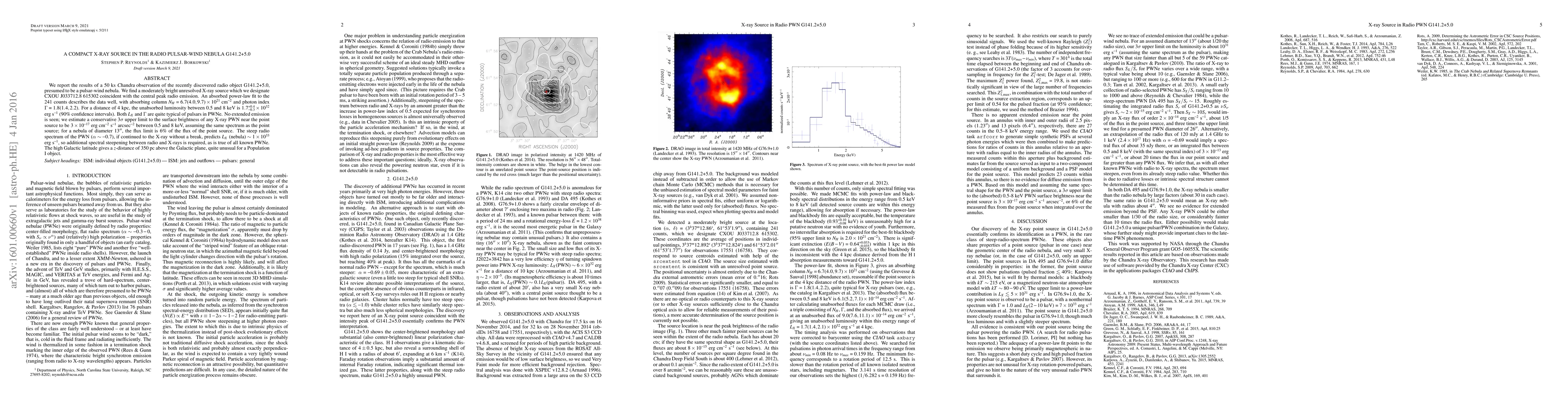 We report the results of a 50 ks Chandra observation of the recently discovered radio object G141.2+5.0, presumed to be a pulsar-wind nebula. We find a moderately bright unresolved X-ray source which we designate CXOU J033712.8 615302 coincident with the central peak radio emission. An absorbed power-law fit to the 241 counts describes the data well, with absorbing column $N_H = 6.7 (4.0, 9.7) \times 10^{21}$ cm$^{-2}$ and photon index $\Gamma = 1.8 (1.4, 2.2)$. For a distance of 4 kpc, the unabsorbed luminosity between 0.5 and 8 keV is $ 1.7^{+0.4}_{-0.3} \times 10^{32}$ erg s$^{-1}$ (90\% confidence intervals). Both $L_X$ and $\Gamma$ are quite typical of pulsars in PWNe. No extended emission is seen; we estimate a conservative $3 \sigma$ upper limit to the surface brightness of any X-ray PWN near the point source to be $3 \times 10^{-17}$ erg cm$^{-2}$ s$^{-1}$ arcsec$^{-2}$ between 0.5 and 8 keV, assuming the same spectrum as the point source; for a nebula of diameter $13"$, the flux limit is 6\% of the flux of the point source. The steep radio spectrum of the PWN ($\alpha \sim -0.7$), if continued to the X-ray without a break, predicts $L_X\ \rm{(nebula)} \sim 1 \times 10^{33}$ erg s$^{-1}$, so additional spectral steepening between radio and X-rays is required, as is true of all known PWNe. The high Galactic latitude gives a $z$-distance of 350 pc above the Galactic plane, quite unusual for a Population I object.