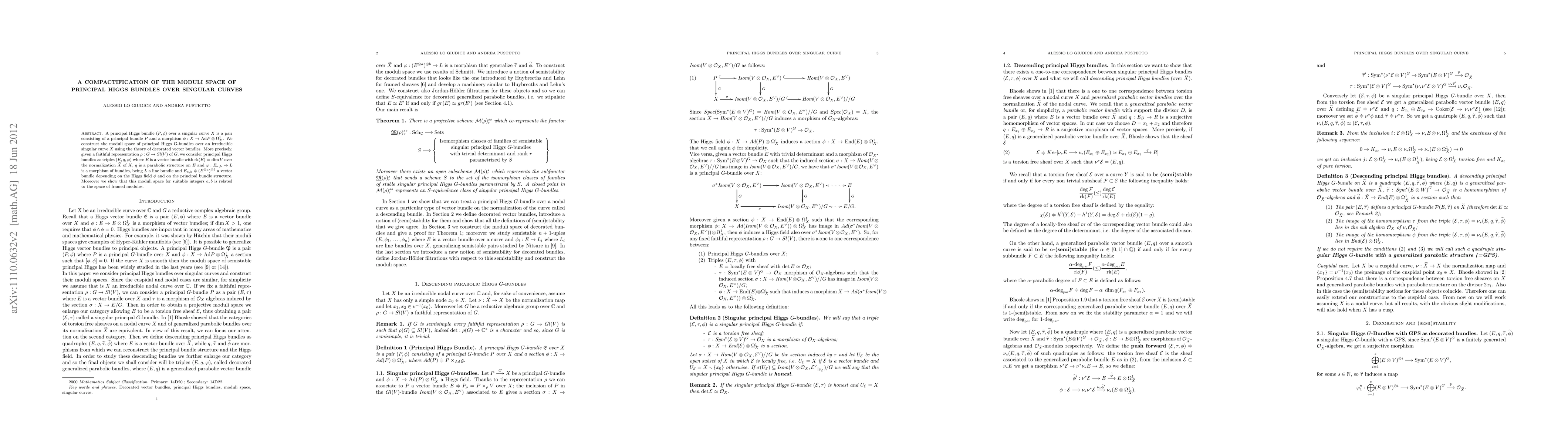 This paper constructs the moduli space of principal Higgs G-bundles over an irreducible singular curve using decorated vector bundles, and demonstrates its relation to the space of framed modules through specific representations and structures.