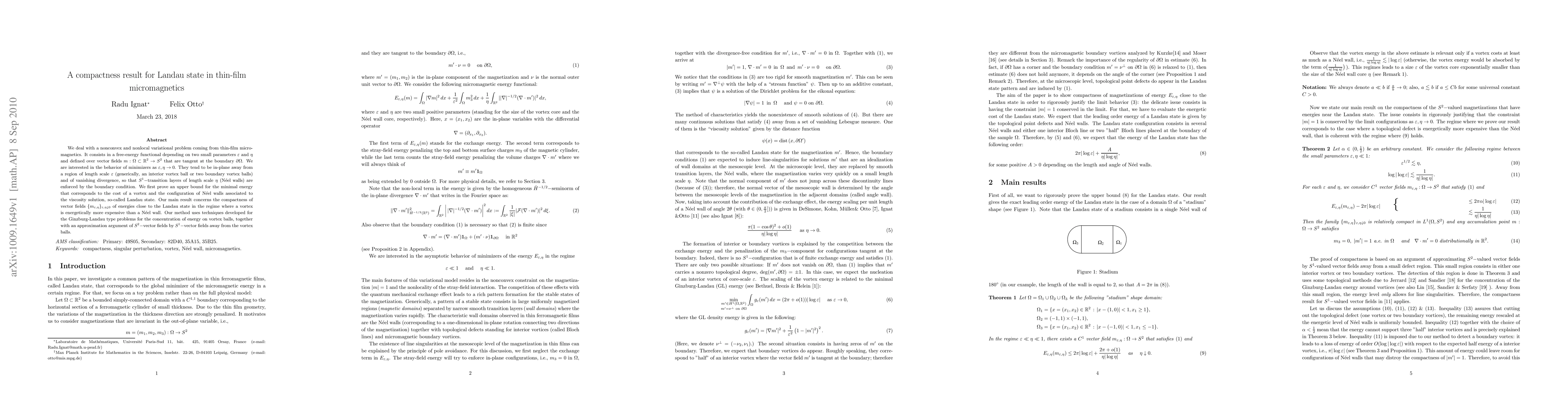 We deal with a nonconvex and nonlocal variational problem coming from thin-film micromagnetics. It consists in a free-energy functional depending on two small parameters $\eps$ and $\eta$ and defined over $S^2-$vector fields $m$ that are tangent at the boundary of a two-dimensional domain $\Omega$. We are interested in the behavior of minimizers as $\eps, \eta \to 0$. The minimizers tend to be in-plane away from a region of length scale $\eps$ (generically, an interior vortex ball or two boundary vortex balls) and of vanishing divergence, so that $S^1-$transition layers of length scale $\eta$ (N\'eel walls) are enforced by the boundary condition. We first prove an upper bound for the minimal energy that corresponds to the cost of a vortex and the configuration of N\'eel walls associated to the viscosity solution, so-called Landau state. Our main result concerns the compactness of vector fields $m_{\eps, \eta}$ of energies close to the Landau state in the regime where a vortex is energetically more expensive than a N\'eel wall. Our method uses techniques developed for the Ginzburg-Landau type problems for the concentration of energy on vortex balls, together with an approximation argument of $S^2-$vector fields by $S^1-$vector fields away from the vortex balls.
