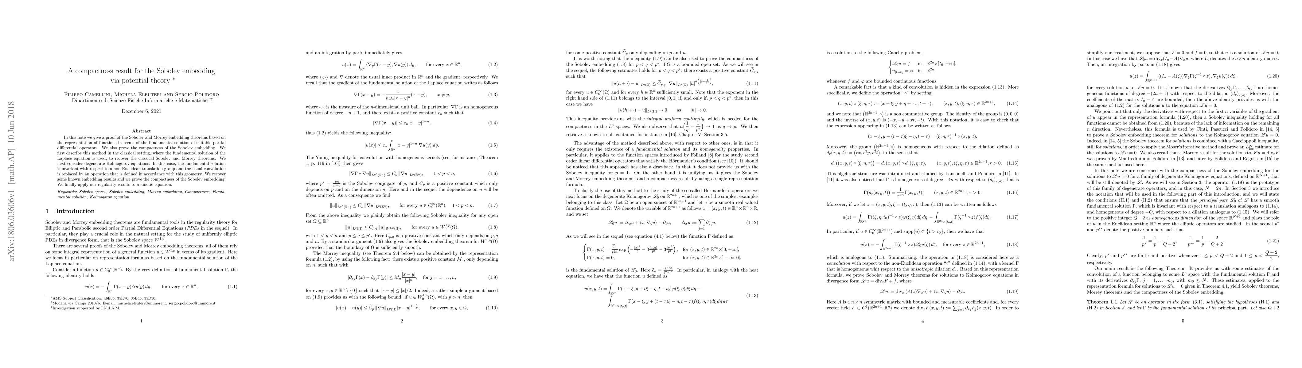 This paper proves the Sobolev and Morrey embedding theorems using potential theory and the fundamental solution of partial differential operators, demonstrating the compactness of the Sobolev embedding. It extends these results to degenerate Kolmogorov equations and applies them to kinetic equations.