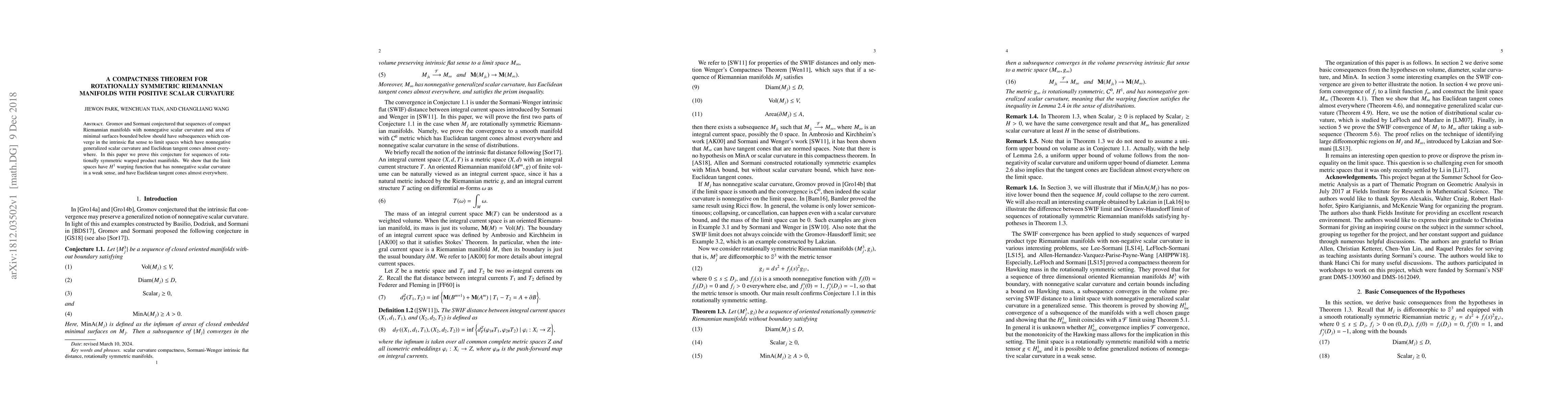 This paper proves Gromov and Sormani's conjecture for rotationally symmetric Riemannian manifolds with nonnegative scalar curvature, showing that such sequences converge to limit spaces with nonnegative generalized scalar curvature and Euclidean tangent cones almost everywhere. The limit spaces exhibit an $H^1$ warping function with nonnegative scalar curvature in a weak sense.