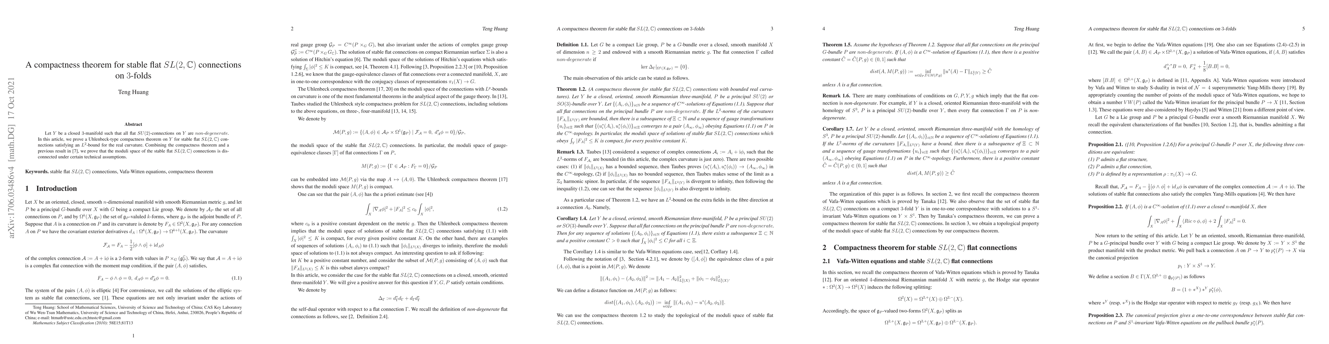 This paper proves a Uhlenbeck-type compactness theorem for stable flat $SL(2,\mathbb{C})$ connections on closed $3$-manifolds with non-degenerate flat $SU(2)$-connections, under an $L^{2}$-bound for the real curvature. It also demonstrates that the moduli space of these connections is disconnected under specific technical assumptions.