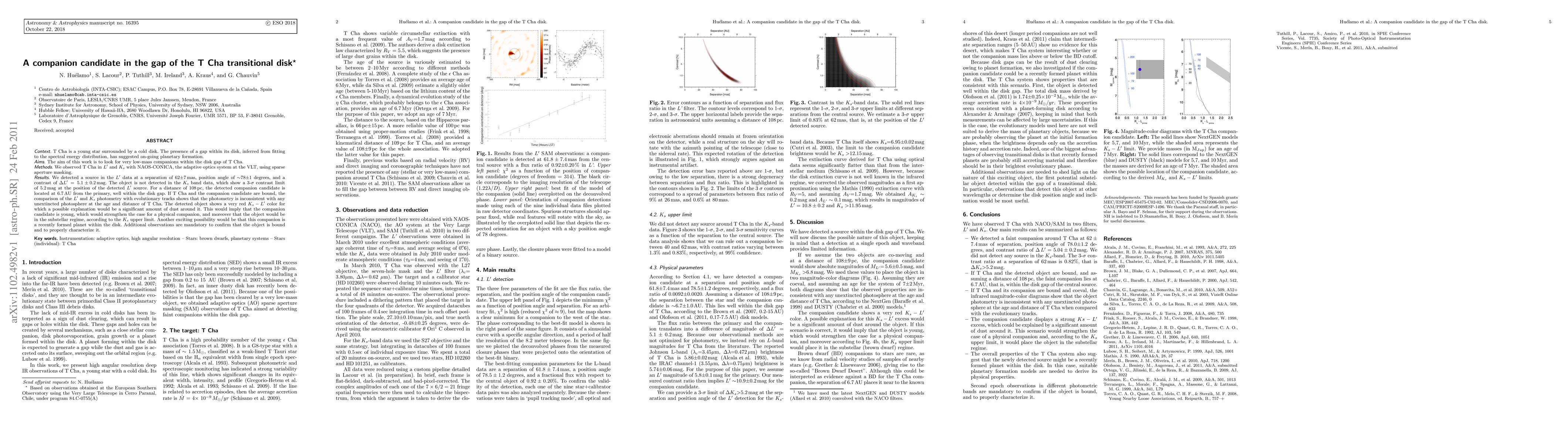 The paper reports the detection of a companion candidate in the gap of the T Cha transitional disk using adaptive optics, suggesting ongoing planetary formation. The candidate shows a red Ks-L' color, indicating potential dust presence and substellar nature, but further observations are needed to confirm its physical association.