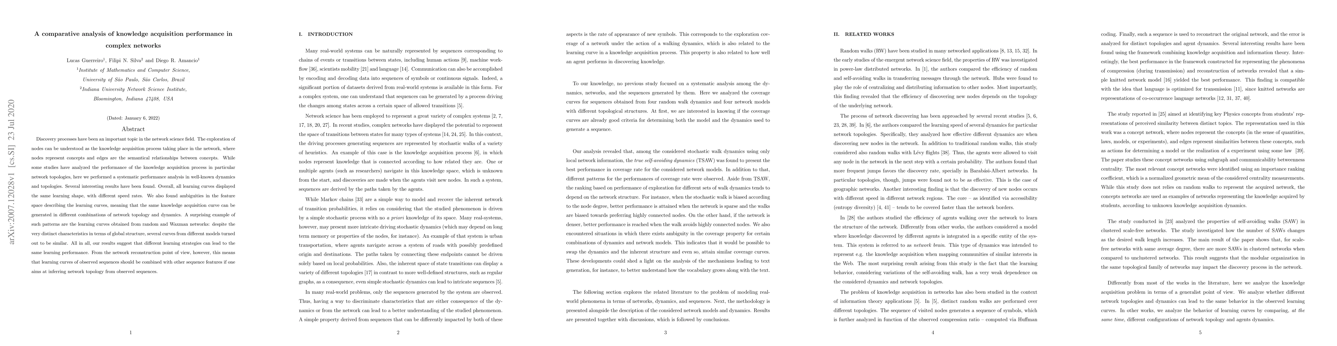 This study analyzes knowledge acquisition performance in complex networks, finding that different learning strategies can lead to similar learning outcomes. It suggests combining observed sequences with other features to infer network topology from observed data.
