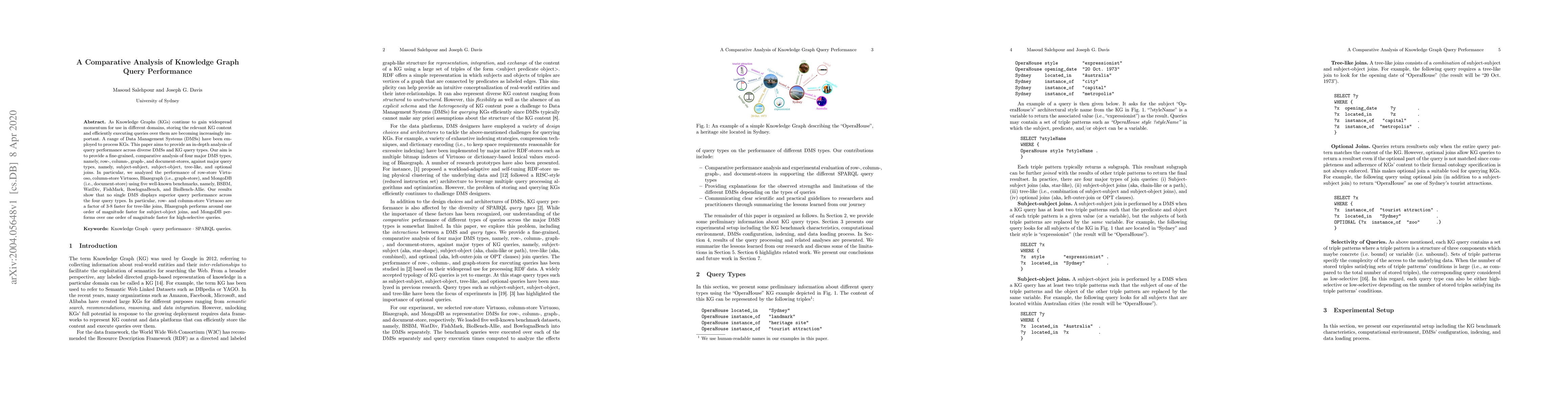 As Knowledge Graphs (KGs) continue to gain widespread momentum for use in different domains, storing the relevant KG content and efficiently executing queries over them are becoming increasingly important. A range of Data Management Systems (DMSs) have been employed to process KGs. This paper aims to provide an in-depth analysis of query performance across diverse DMSs and KG query types. Our aim is to provide a fine-grained, comparative analysis of four major DMS types, namely, row-, column-, graph-, and document-stores, against major query types, namely, subject-subject, subject-object, tree-like, and optional joins. In particular, we analyzed the performance of row-store Virtuoso, column-store Virtuoso, Blazegraph (i.e., graph-store), and MongoDB (i.e., document-store) using five well-known benchmarks, namely, BSBM, WatDiv, FishMark, BowlognaBench, and BioBench-Allie. Our results show that no single DMS displays superior query performance across the four query types. In particular, row- and column-store Virtuoso are a factor of 3-8 faster for tree-like joins, Blazegraph performs around one order of magnitude faster for subject-object joins, and MongoDB performs over one order of magnitude faster for high-selective queries.