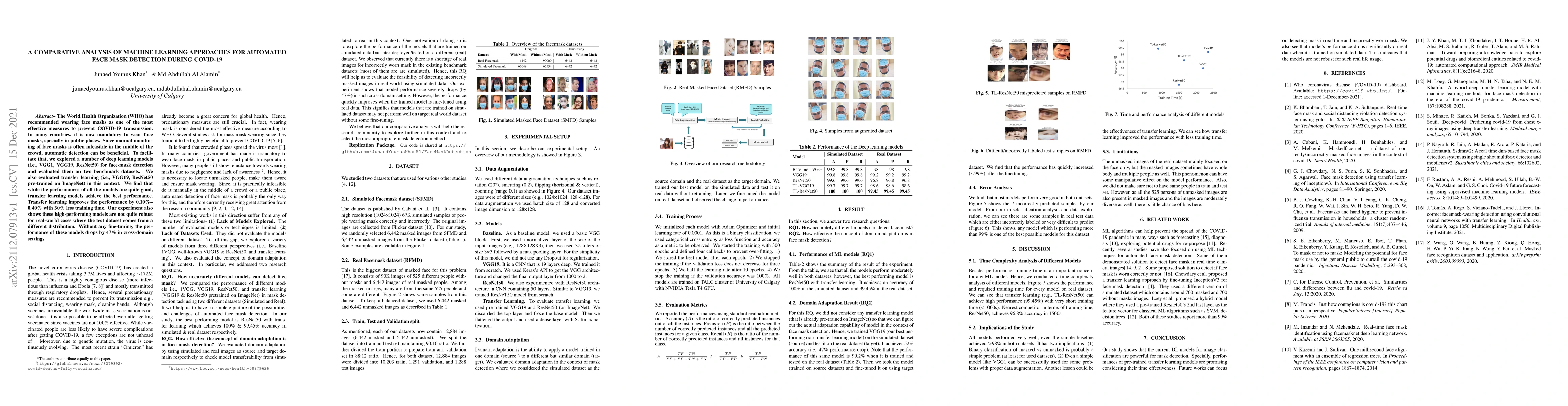 This research compares deep learning models for automated face mask detection during COVID-19, finding transfer learning models like VGG19 and ResNet50 pre-trained on ImageNet perform best, improving accuracy with less training time. However, these models struggle in real-world scenarios with different data distributions, losing 47% accuracy without fine-tuning.