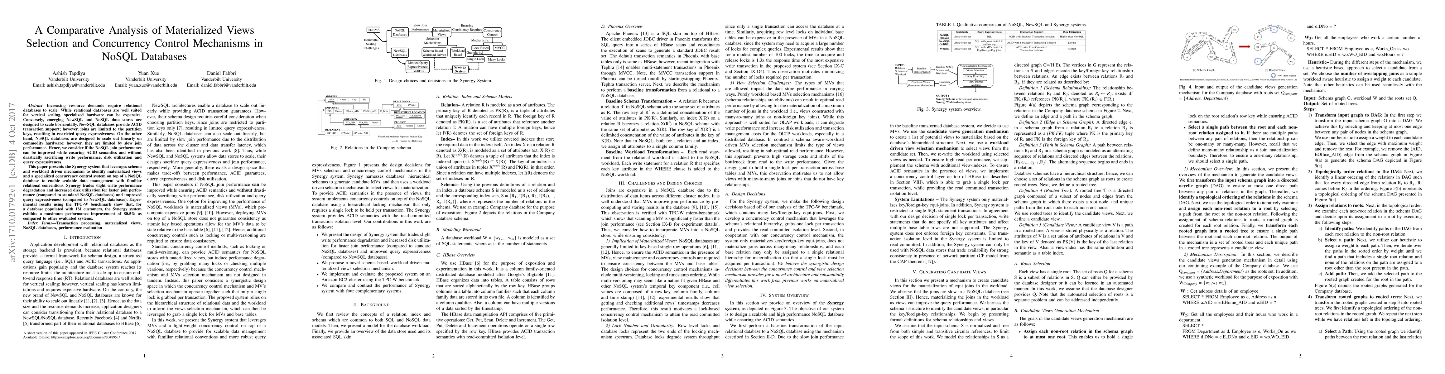 This paper introduces Synergy, a system that uses materialized views and a specialized concurrency control mechanism to enhance join performance in NoSQL databases while maintaining ACID semantics. Experimental results show Synergy achieves up to 80.5% better performance compared to other systems, albeit with slight trade-offs in write performance and disk utilization.