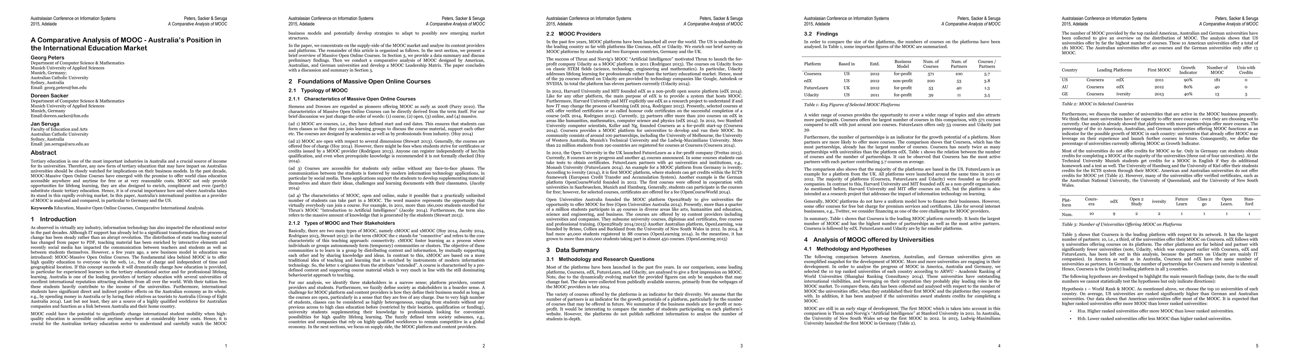 Tertiary education is one of the most important industries in Australia and a crucial source of income for its universities. Therefore, any new form of tertiary education that may have impact on Australian universities should be closely watched for implications on their business models. In the past decade, MOOC-Massive Open Online Courses have emerged with the promise to offer world class education accessible anywhere and anytime for free or at very reasonable costs. MOOC not only provide opportunities for lifelong learning, they are also designed to enrich, compliment and even (partly) substitute classic tertiary education. Hence, it is of crucial importance how and where Australia takes its stand in this rapidly evolving market. In this paper, Australia's international position as a provider of MOOC is analysed and compared, in particular to Germany and the US.