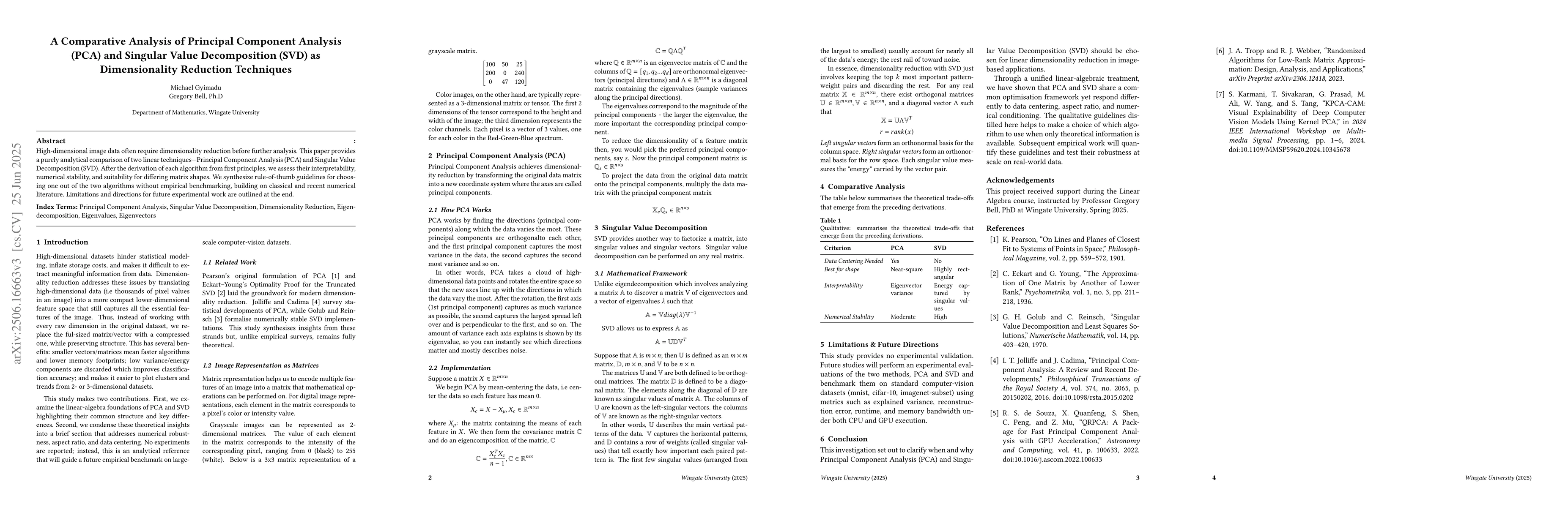 High-dimensional image data often require dimensionality reduction before further analysis. This paper provides a purely analytical comparison of two linear techniques-Principal Component Analysis (PCA) and Singular Value Decomposition (SVD). After the derivation of each algorithm from first principles, we assess their interpretability, numerical stability, and suitability for differing matrix shapes. We synthesize rule-of-thumb guidelines for choosing one out of the two algorithms without empirical benchmarking, building on classical and recent numerical literature. Limitations and directions for future experimental work are outlined at the end.