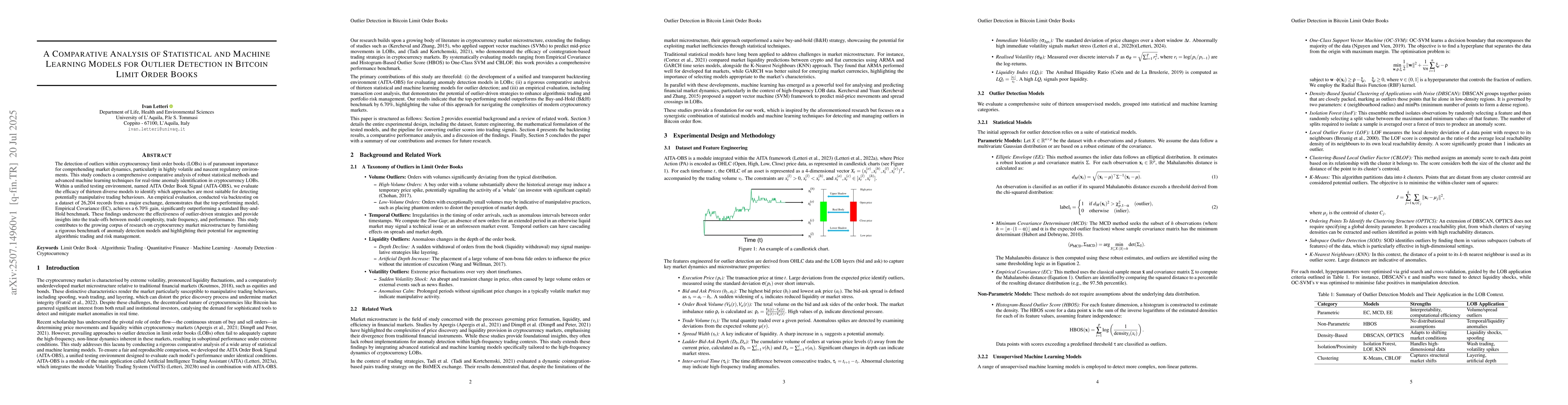 The detection of outliers within cryptocurrency limit order books (LOBs) is of paramount importance for comprehending market dynamics, particularly in highly volatile and nascent regulatory environments. This study conducts a comprehensive comparative analysis of robust statistical methods and advanced machine learning techniques for real-time anomaly identification in cryptocurrency LOBs. Within a unified testing environment, named AITA Order Book Signal (AITA-OBS), we evaluate the efficacy of thirteen diverse models to identify which approaches are most suitable for detecting potentially manipulative trading behaviours. An empirical evaluation, conducted via backtesting on a dataset of 26,204 records from a major exchange, demonstrates that the top-performing model, Empirical Covariance (EC), achieves a 6.70% gain, significantly outperforming a standard Buy-and-Hold benchmark. These findings underscore the effectiveness of outlier-driven strategies and provide insights into the trade-offs between model complexity, trade frequency, and performance. This study contributes to the growing corpus of research on cryptocurrency market microstructure by furnishing a rigorous benchmark of anomaly detection models and highlighting their potential for augmenting algorithmic trading and risk management.
