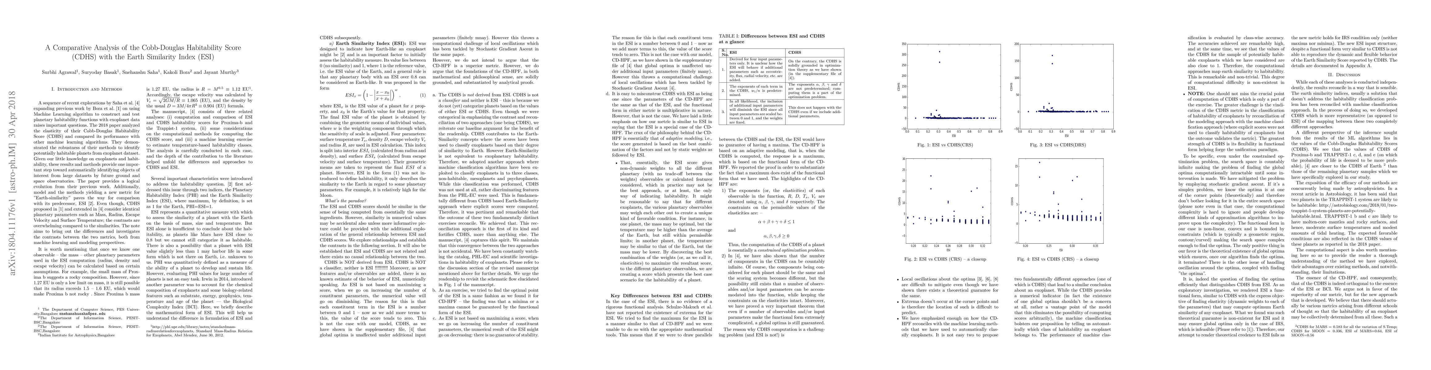 A comparative analysis found that the Cobb-Douglas Habitability Score (CDHS) and Earth Similarity Index (ESI) do not share a causal relationship or sensible connection, suggesting both should be used independently for habitability assessments.