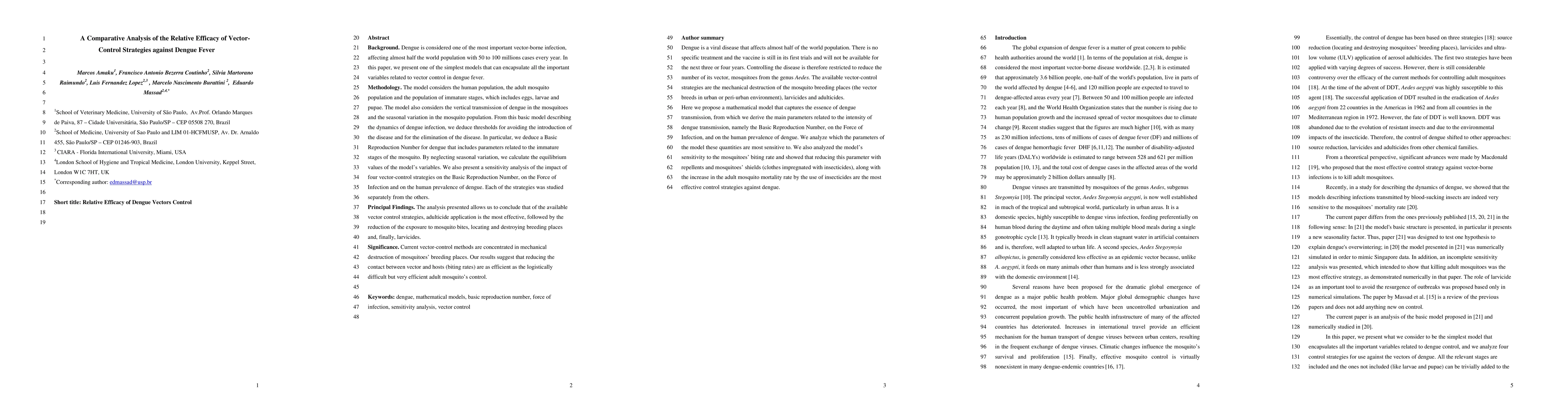 This research compares the efficacy of various vector-control strategies against dengue fever, finding that adulticide application is the most effective, followed by reducing exposure to mosquito bites, destroying breeding places, and using larvicides. The study emphasizes the importance of reducing contact rates between vectors and hosts.