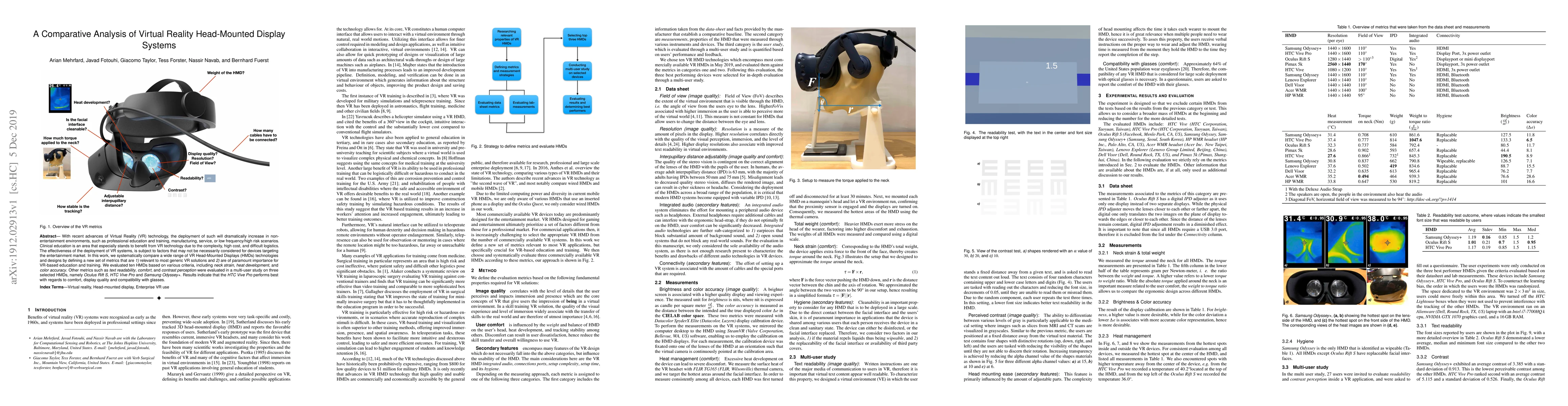 This paper systematically compares various VR Head-Mounted Display (HMD) technologies, focusing on metrics relevant to professional education and training. The HTC Vive Pro emerged as the best performer in terms of comfort, display quality, and compatibility with glasses, highlighting its potential benefits in clinical education.