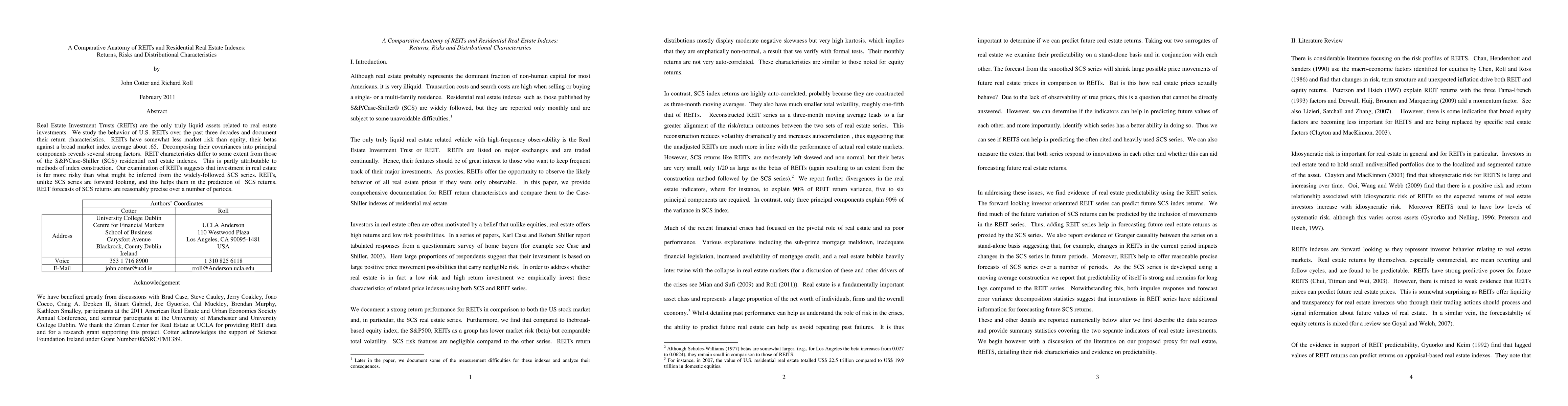 This paper compares the return characteristics and risks of U.S. REITs to those of the S&P/Case-Shiller residential real estate indexes, finding that REITs exhibit less market risk and are more forward-looking, suggesting real estate investment is riskier than indicated by traditional indexes. REIT forecasts of SCS returns are also reasonably accurate.
