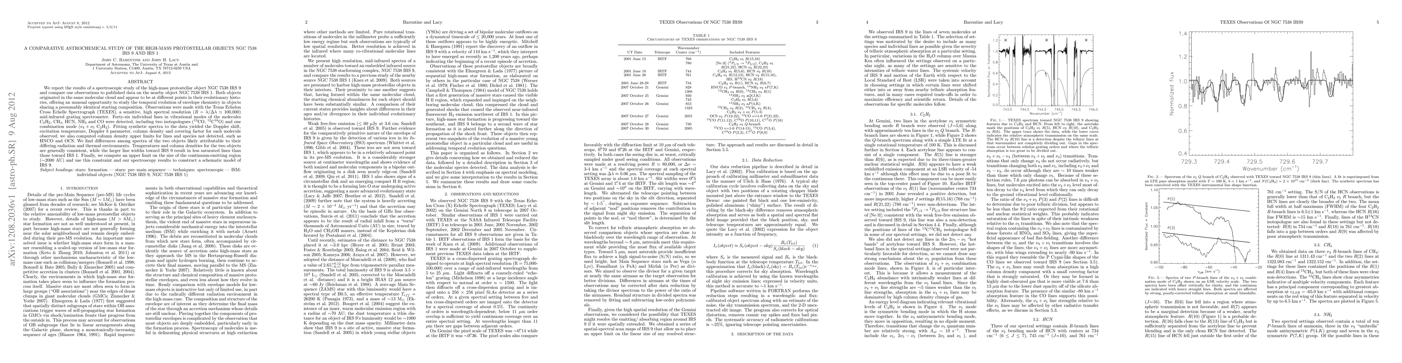 This study compares spectroscopic data from high-mass protostellar objects NGC 7538 IRS 9 and IRS 1 using the TEXES spectrometer, revealing differences in their chemical compositions likely due to varying radiation and thermal environments. The analysis identifies molecular lines of C2H2, CH4, HCN, NH3, and CO, providing insights into the temporal evolution of envelope chemistry in these objects.