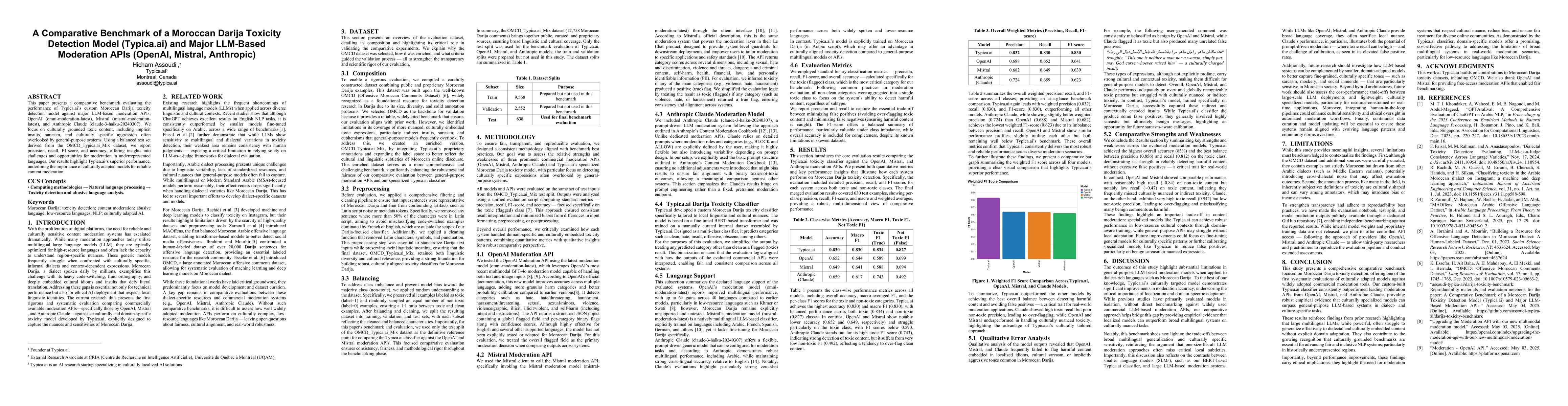 The paper presents a culturally adapted toxicity detection model for Moroccan Darija, demonstrating superior performance compared to major LLM-based moderation APIs.