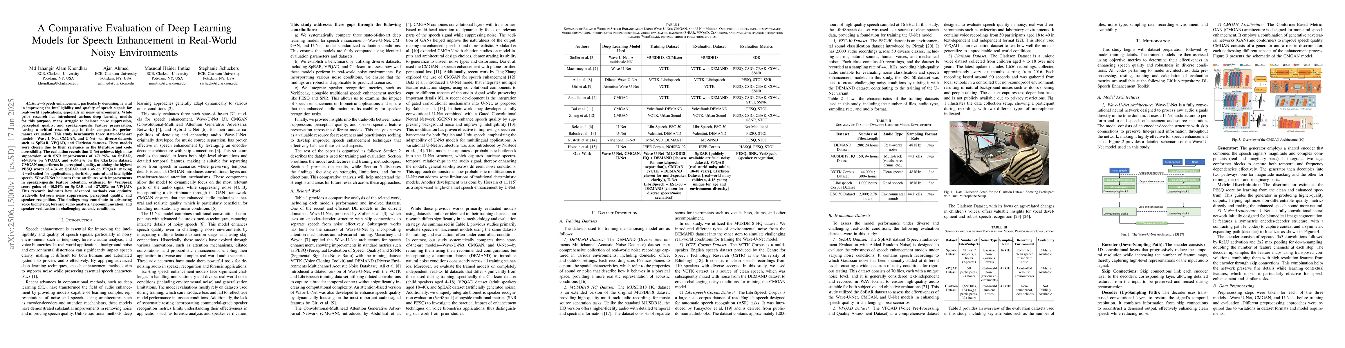 Speech enhancement, particularly denoising, is vital in improving the intelligibility and quality of speech signals for real-world applications, especially in noisy environments. While prior research has introduced various deep learning models for this purpose, many struggle to balance noise suppression, perceptual quality, and speaker-specific feature preservation, leaving a critical research gap in their comparative performance evaluation. This study benchmarks three state-of-the-art models Wave-U-Net, CMGAN, and U-Net, on diverse datasets such as SpEAR, VPQAD, and Clarkson datasets. These models were chosen due to their relevance in the literature and code accessibility. The evaluation reveals that U-Net achieves high noise suppression with SNR improvements of +71.96% on SpEAR, +64.83% on VPQAD, and +364.2% on the Clarkson dataset. CMGAN outperforms in perceptual quality, attaining the highest PESQ scores of 4.04 on SpEAR and 1.46 on VPQAD, making it well-suited for applications prioritizing natural and intelligible speech. Wave-U-Net balances these attributes with improvements in speaker-specific feature retention, evidenced by VeriSpeak score gains of +10.84% on SpEAR and +27.38% on VPQAD. This research indicates how advanced methods can optimize trade-offs between noise suppression, perceptual quality, and speaker recognition. The findings may contribute to advancing voice biometrics, forensic audio analysis, telecommunication, and speaker verification in challenging acoustic conditions.