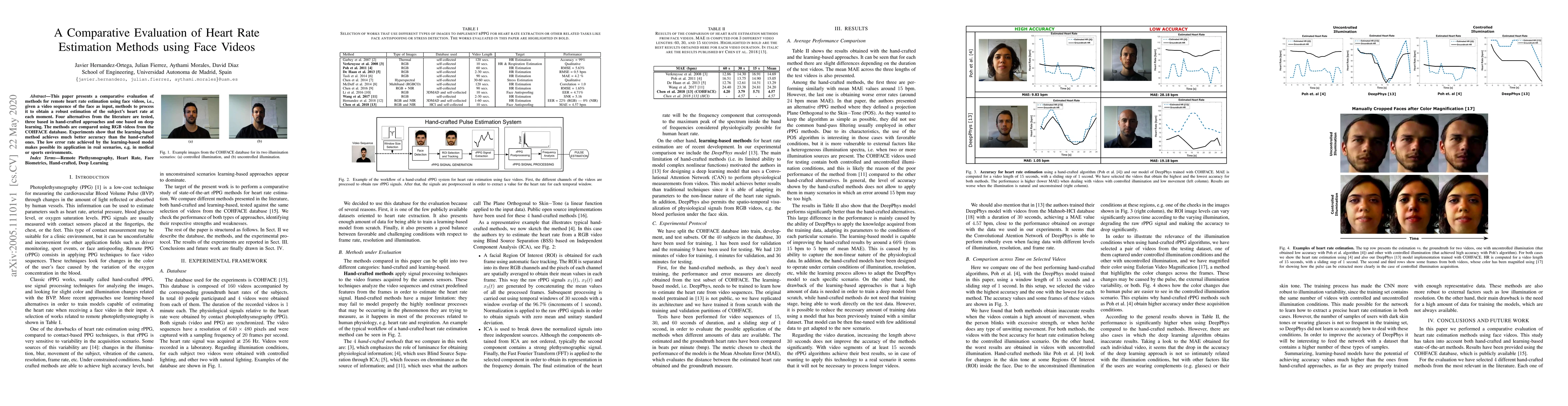 This paper evaluates four methods for estimating heart rate from face videos, comparing three handcrafted approaches and one deep learning-based method. Results show that the deep learning model significantly outperforms the handcrafted methods, demonstrating potential for real-world applications in medical and sports settings.