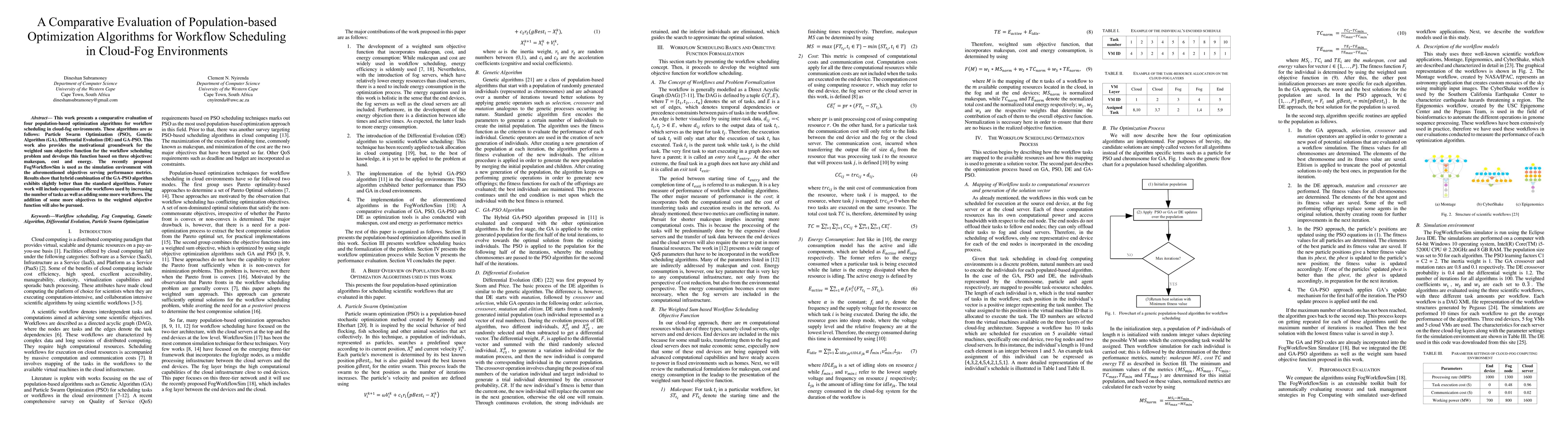 This paper evaluates four population-based optimization algorithms—PSO, GA, DE, and GA-PSO—for workflow scheduling in cloud-fog environments, using FogWorkflowSim for simulations. The study finds that the hybrid GA-PSO algorithm performs slightly better than the others, based on makespan, cost, and energy metrics. Future research will expand workflows and objectives.