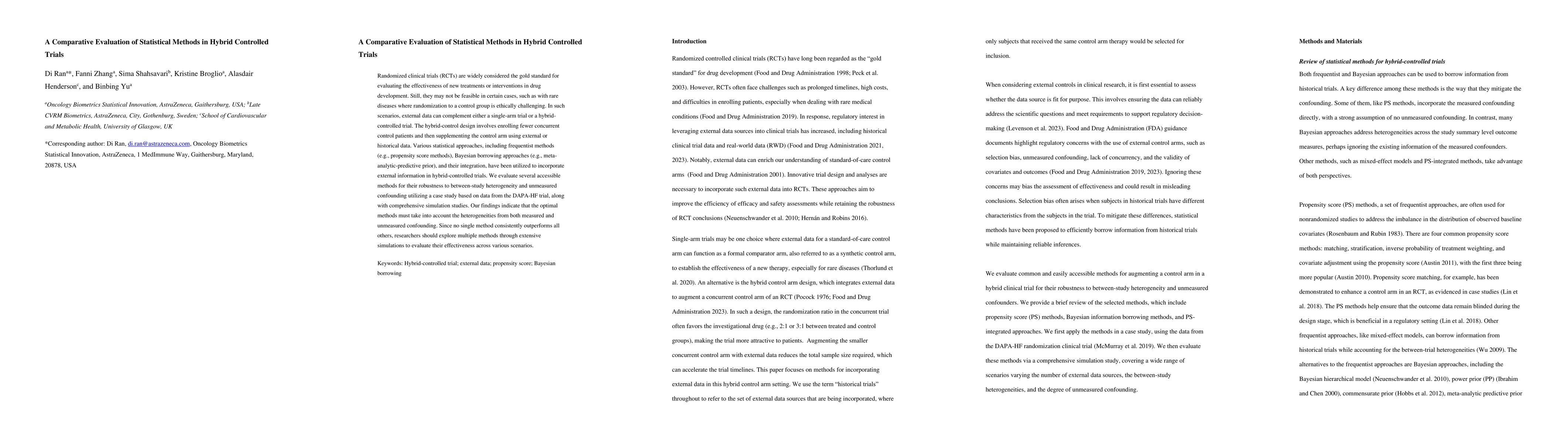 Randomized clinical trials (RCTs) are widely considered the gold standard for evaluating the effectiveness of new treatments or interventions in drug development. Still, they may not be feasible in certain cases, such as with rare diseases where randomization to a control group is ethically challenging. In such scenarios, external data can complement either a single-arm trial or a hybrid-controlled trial. The hybrid-control design involves enrolling fewer concurrent control patients and then supplementing the control arm using external or historical data. Various statistical approaches, including frequentist methods (e.g., propensity score methods), Bayesian borrowing approaches (e.g., meta-analytic-predictive prior), and their integration, have been utilized to incorporate external information in hybrid-controlled trials. We evaluate several accessible methods for their robustness to between-study heterogeneity and unmeasured confounding utilizing a case study based on data from the DAPA-HF trial, along with comprehensive simulation studies. Our findings indicate that the optimal methods must take into account the heterogeneities from both measured and unmeasured confounding. Since no single method consistently outperforms all others, researchers should explore multiple methods through extensive simulations to evaluate their effectiveness across various scenarios.