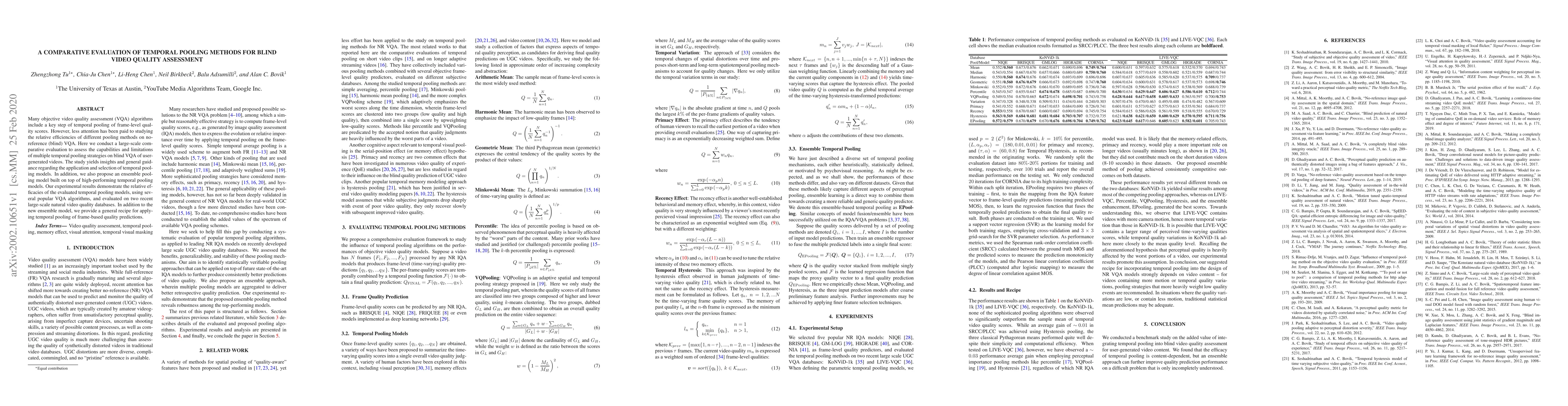 Title: A Comparative Evaluation of Temporal Pooling Methods for Blind Video Quality Assessment Summary: This study conducts a comparative evaluation of various temporal pooling strategies for blind video quality assessment, revealing insights on their efficiencies and proposing an ensemble pooling model. Experimental results highlight the relative performance of these methods across popular algorithms and large-scale video databases.