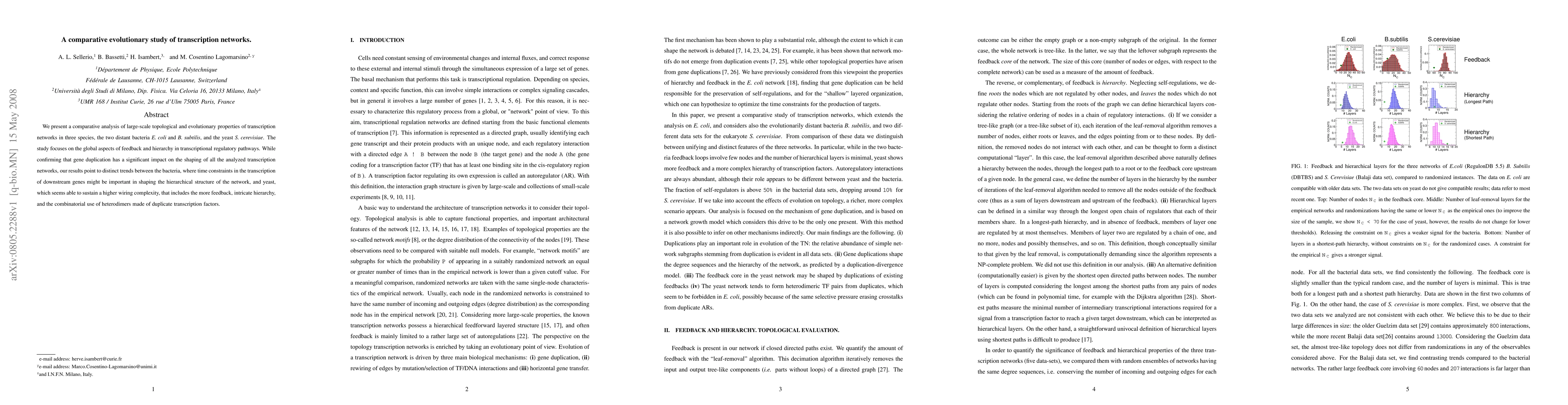 This study compares the evolutionary and topological traits of transcription networks in E. coli, B. subtilis, and S. cerevisiae, highlighting the role of gene duplication and the influence of time constraints on bacterial networks versus the higher wiring complexity and feedback in yeast.