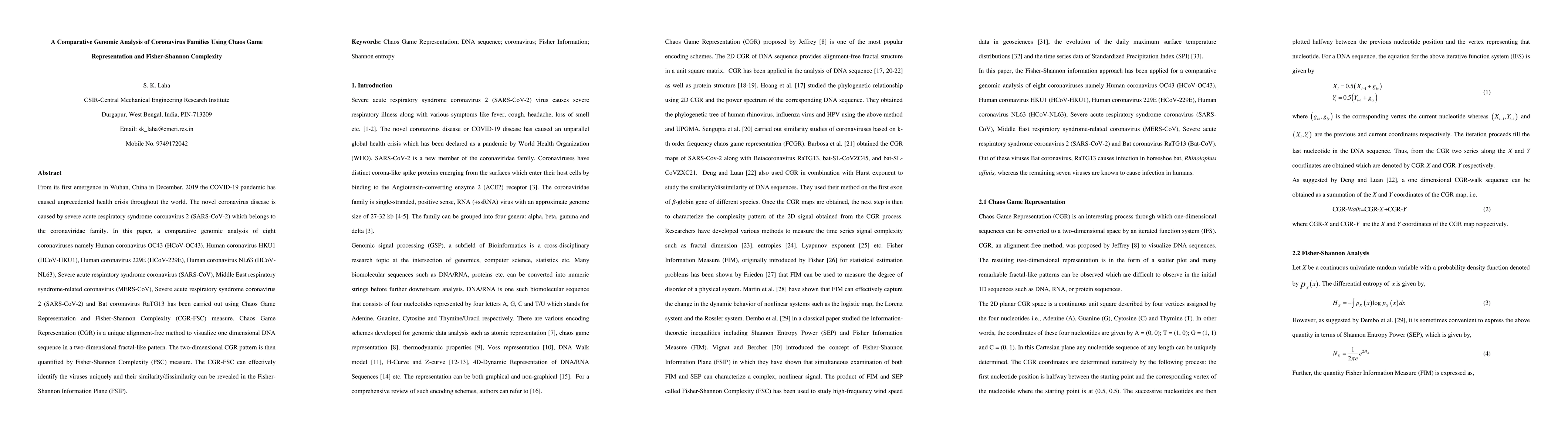 This paper conducts a comparative genomic analysis of eight coronaviruses using Chaos Game Representation and Fisher-Shannon Complexity to visualize and quantify DNA sequences. The method identifies unique viral signatures and reveals their similarities and differences in a two-dimensional fractal-like pattern.