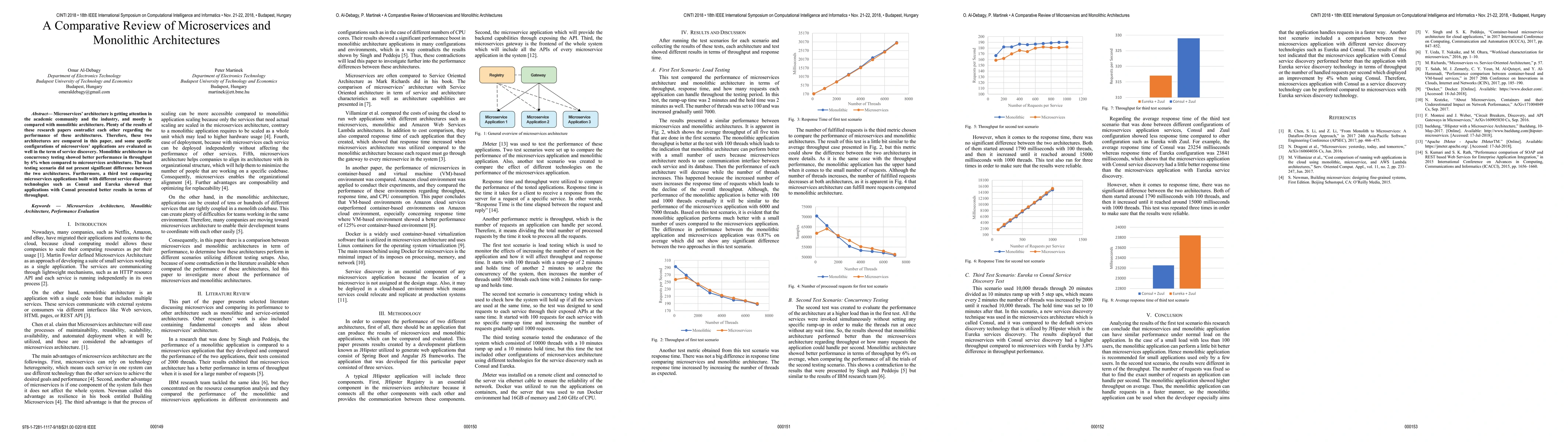 This paper compares microservices and monolithic architectures, finding that monolithic architecture performs better in concurrency testing by 6% but shows no significant difference in load testing. It also evaluates microservices with different service discovery technologies, concluding that Consul yields better throughput results.