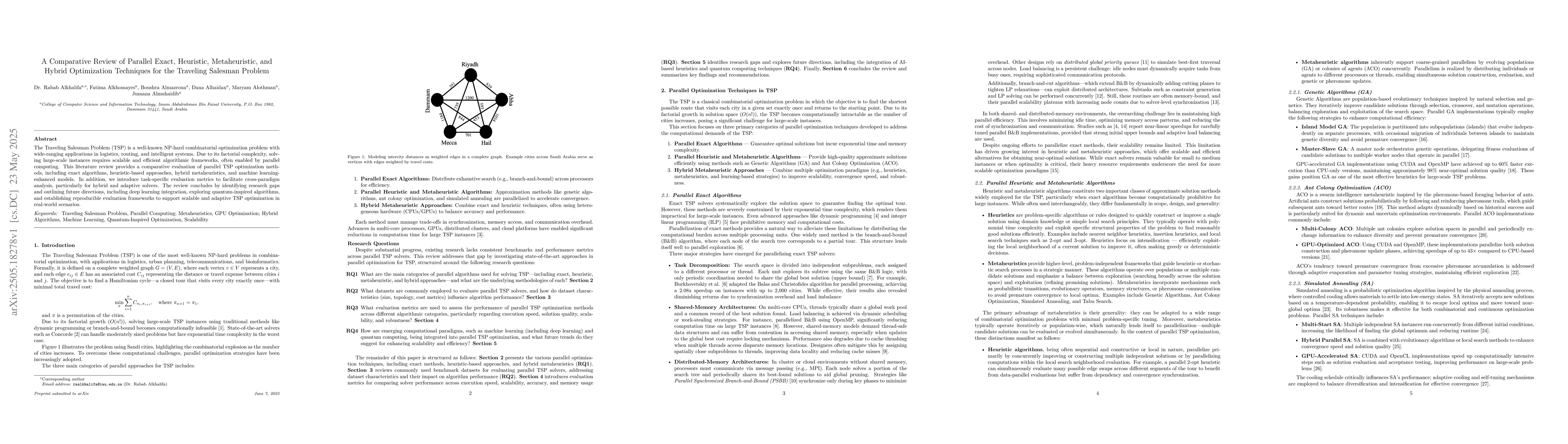 This research conducts a comparative literature review of parallel optimization techniques for the Traveling Salesman Problem (TSP), encompassing exact algorithms, heuristic approaches, hybrid metaheuristics, and machine learning-enhanced models.