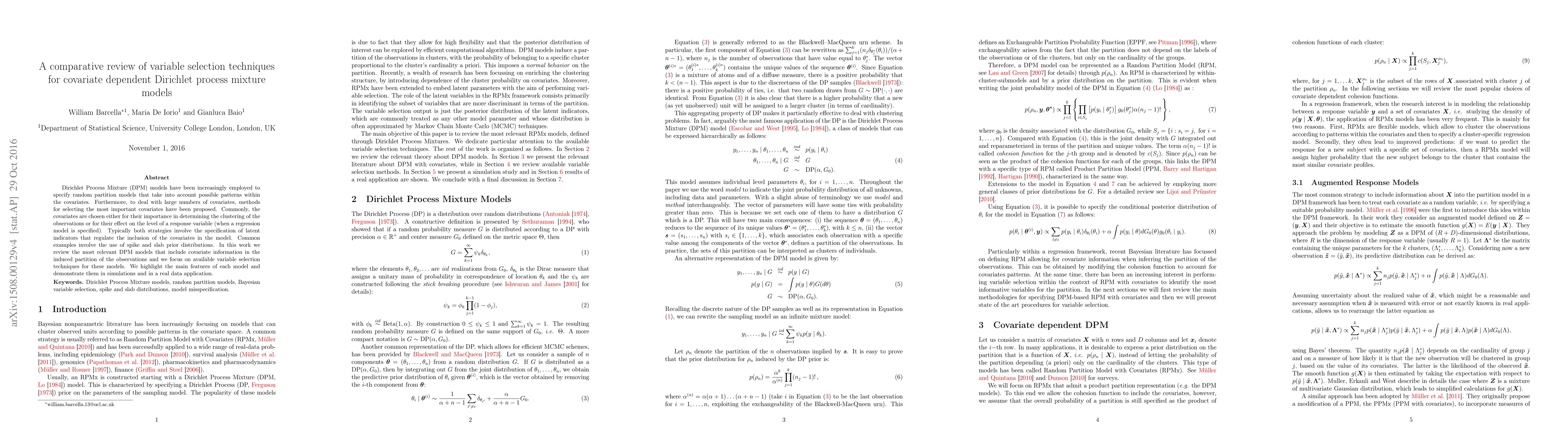 This paper reviews variable selection techniques for Dirichlet Process Mixture models that incorporate covariate information. It highlights various methods for selecting important covariates, compares their features, and demonstrates their effectiveness through simulations and a real data application.