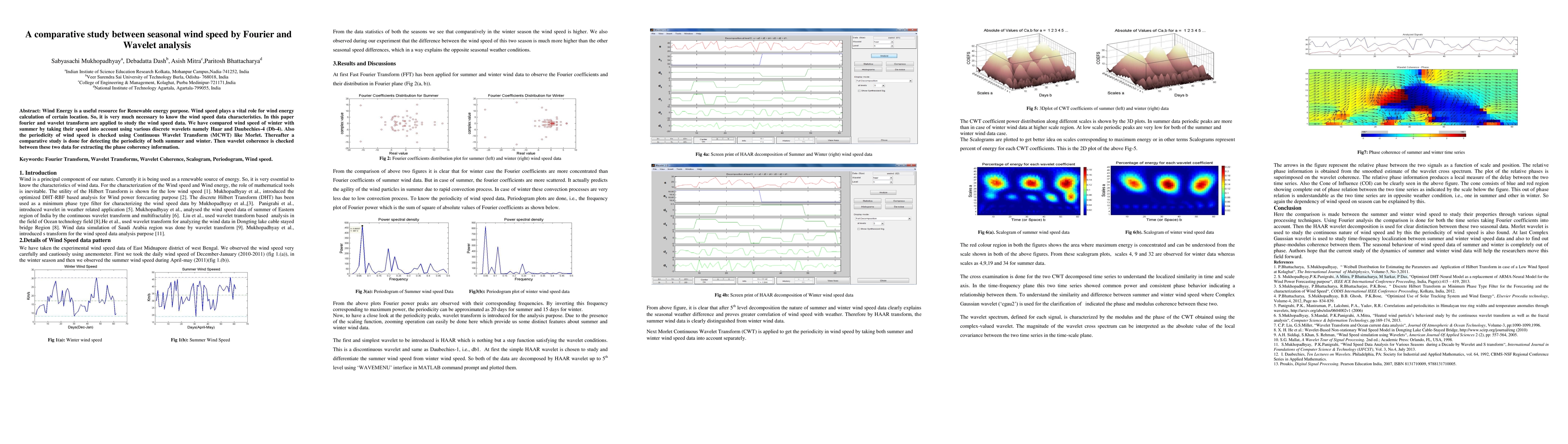 Wind Energy is a useful resource for Renewable energy purpose. Wind speed plays a vital role for wind energy calculation of certain location. So, it is very much necessary to know the wind speed data characteristics. In this paper fourier and wavelet transform are applied to study the wind speed data. We have compared wind speed of winter with summer by taking their speed into account using various discrete wavelets namely Haar and Daubechies-4 (Db-4). Also the periodicity of wind speed is checked using Continuous Wavelet Transform (MCWT) like Morlet. Thereafter a comparative study is done for detecting the periodicity of both summer and winter. Then wavelet coherence is checked between these two data for extracting the phase coherency information.