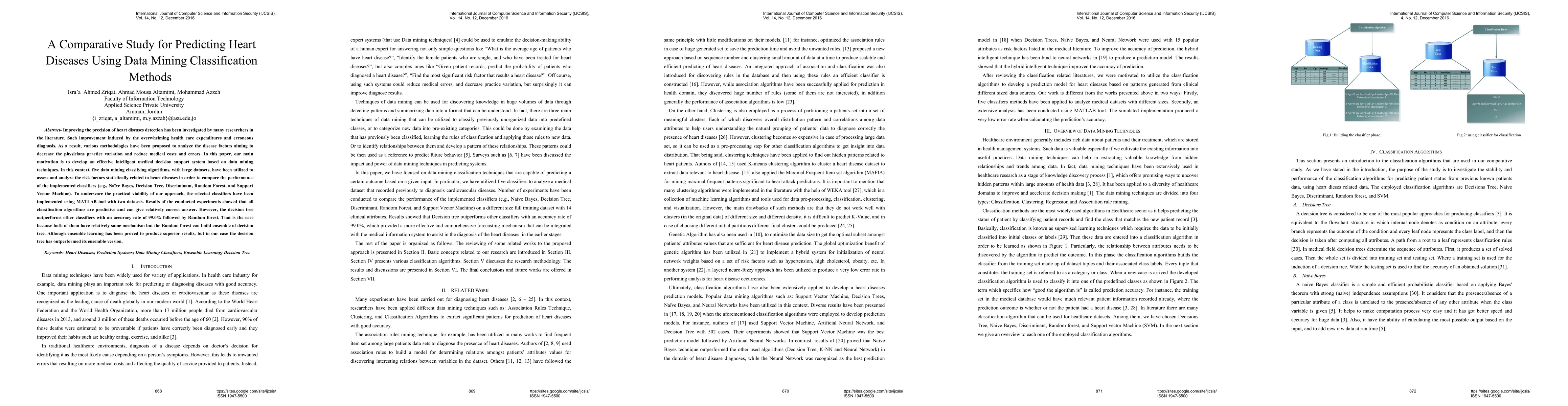 A study compares five data mining algorithms to predict heart diseases with high accuracy, finding that a decision tree outperforms others with 99.0% accuracy rate.