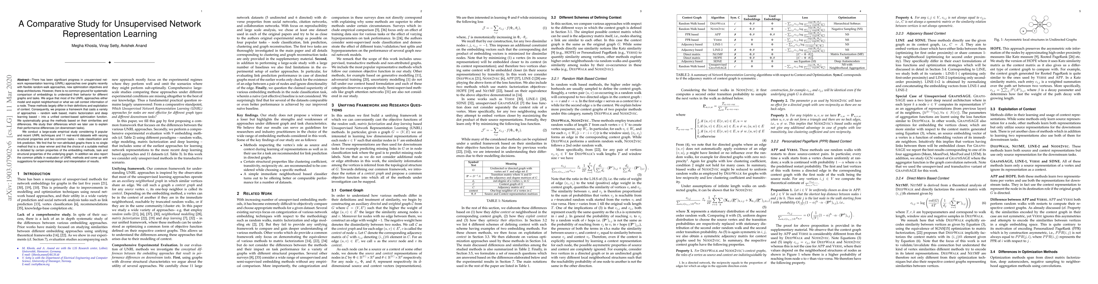 A comparative study investigates 9 popular unsupervised network representation learning methods on 11 real-world datasets, finding no single method as a clear winner and highlighting the importance of task, structural properties, and embedding characteristics in choosing a suitable method.