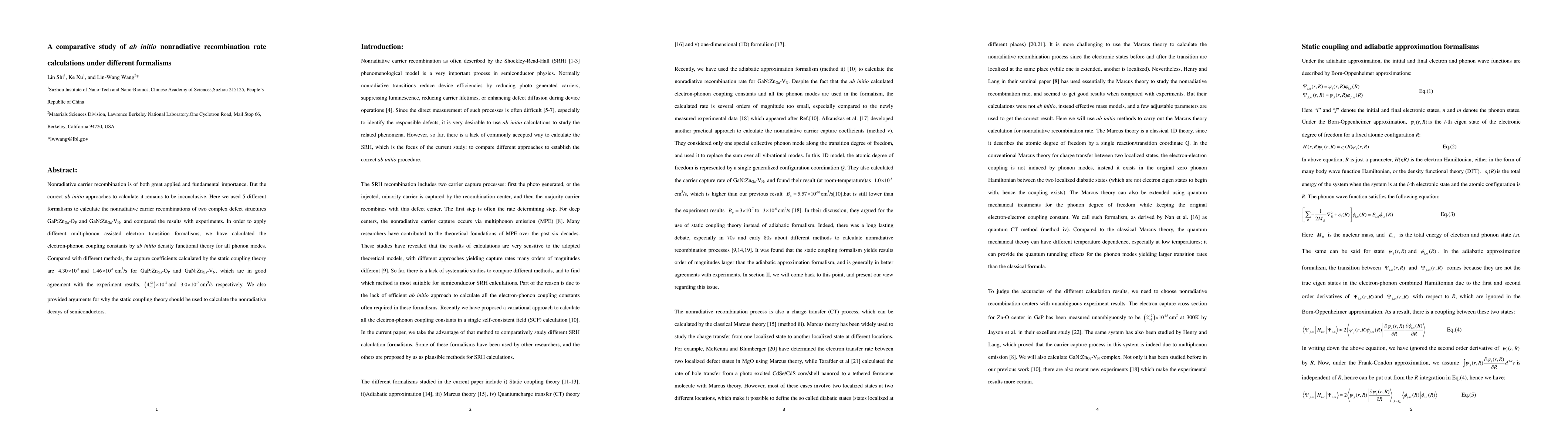 Nonradiative carrier recombination is of both great applied and fundamental importance.But the correct ab initio approaches to calculate it remains to be inconclusive. Here we used 5 different formalisms to calculate the nonradiative carrier recombinations of two complex defect structures GaP:Zn_Ga-O_P and GaN:Zn_Ga-V_N, and compared the results with experiments.In order to apply different multiphonon assisted electron transition formalisms, we have calculated the electron-phonon coupling constants by ab initio density functional theory for all phonon modes. Compared with different methods, the capture coefficients calculated by the static coupling theory are 4.30*10^-8 and 1.46*10^-7 cm^3/s for GaP:Zn_Ga-O_P and GaN:Zn_Ga-V_N, which are in good agreement with the experiment results, 4*10^-8 and 3.0*10^-7 cm^3/s respectively. We also provided arguments for why the static coupling theory should be used to calculate the nonradiative decays of semiconductors.